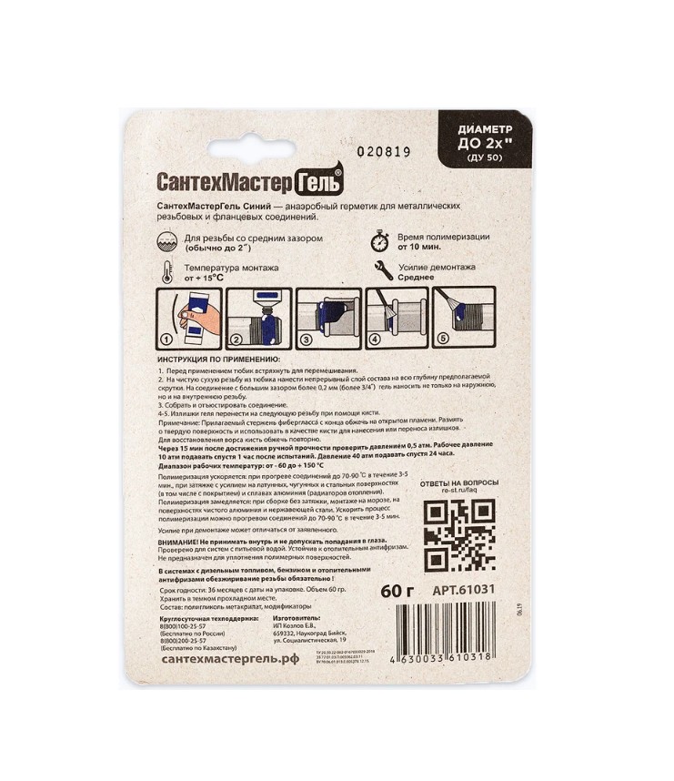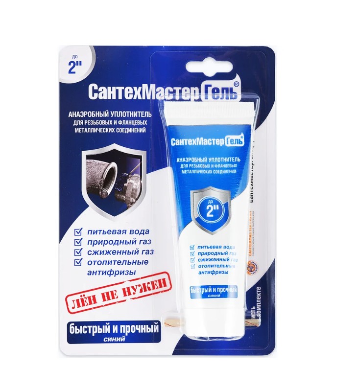 Гель СантехМастер Синий, тюбик 60 г, блистер 04019 — это резьбовой герметик для сантехники со средней степенью фиксации соединения. Данный состав рекомендован к использованию для герметизации металлических резьб, фитингов и фланцев. Используется для соединений диаметром до 2". Соединение, собранное на данный гель поддается демонтажу с использованием инструмента.