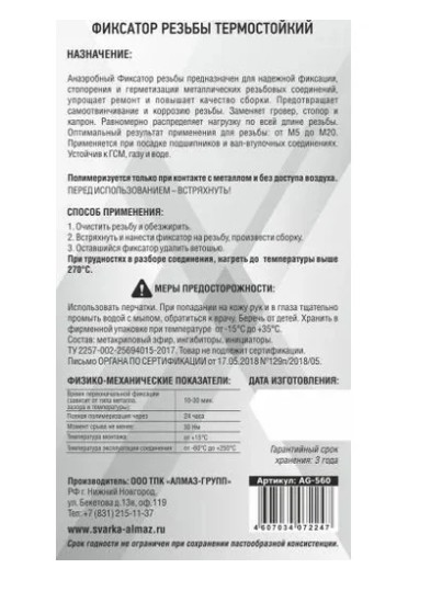 Анаэробный Фиксатор резьбы предназначен для надежной фиксации, стопорения и герметизации металлических резьбовых соединений. Работает в условиях и на участках с повышенными температурными нагрузками. Заменяет гровер, стопор и капрон (гровер не нужен).
