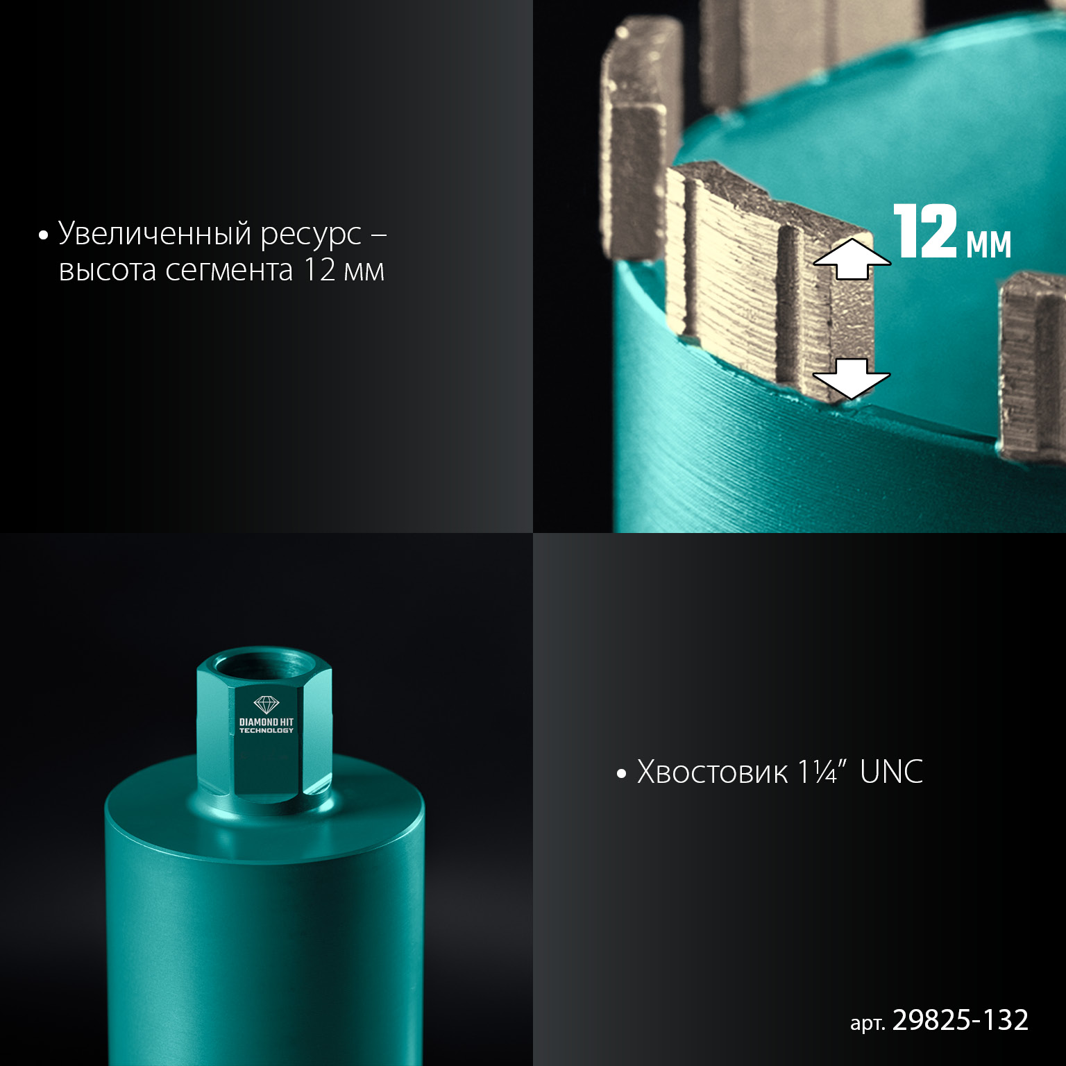 Для сухого сверления отверстий в железобетоне, кирпиче и других строительных материалах. Используются с установками алмазного бурения с функцией микроудара мощностью от 2 кВт.