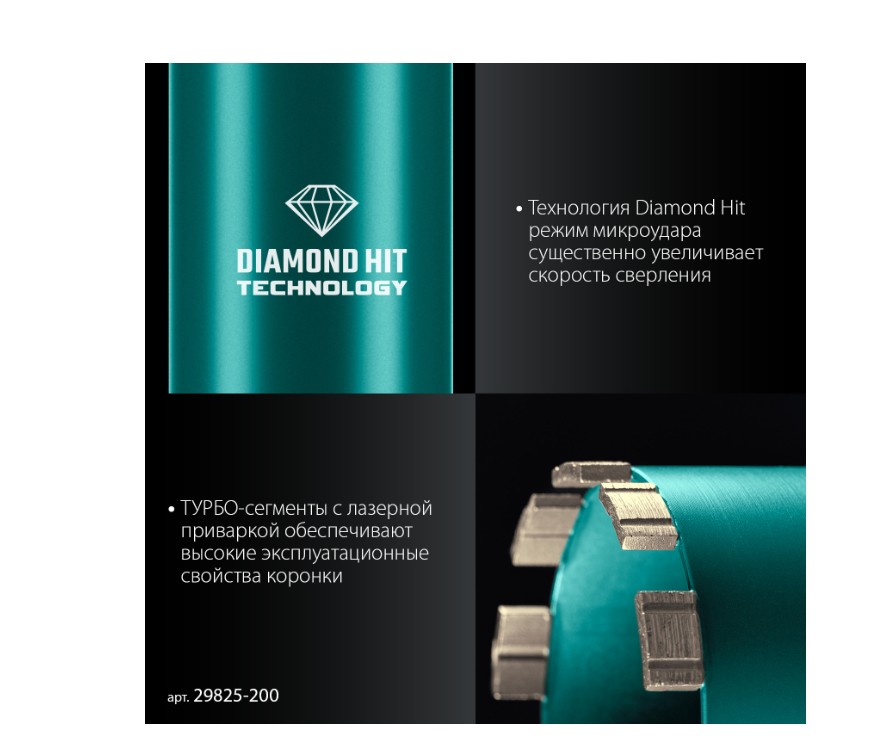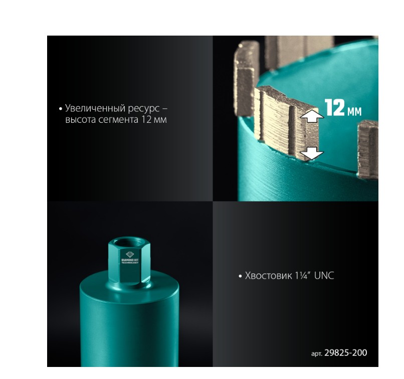 Для сухого сверления отверстий в железобетоне, кирпиче и других строительных материалах. Используются с установками алмазного бурения с функцией микроудара мощностью от 2 кВт.