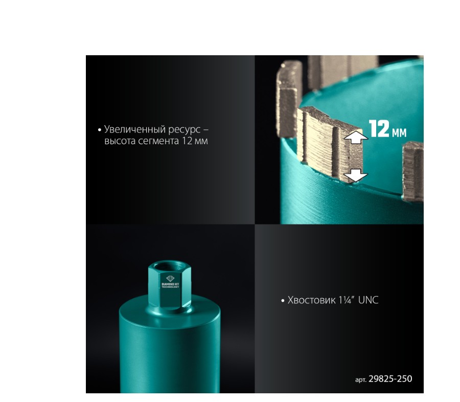 Для сухого сверления отверстий в железобетоне, кирпиче и других строительных материалах. Используются с установками алмазного бурения с функцией микроудара мощностью от 2 кВт.
