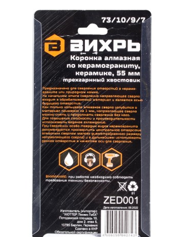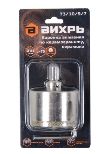 Коронка алмазная по керамограниту/керамике, 55 мм Вихрь