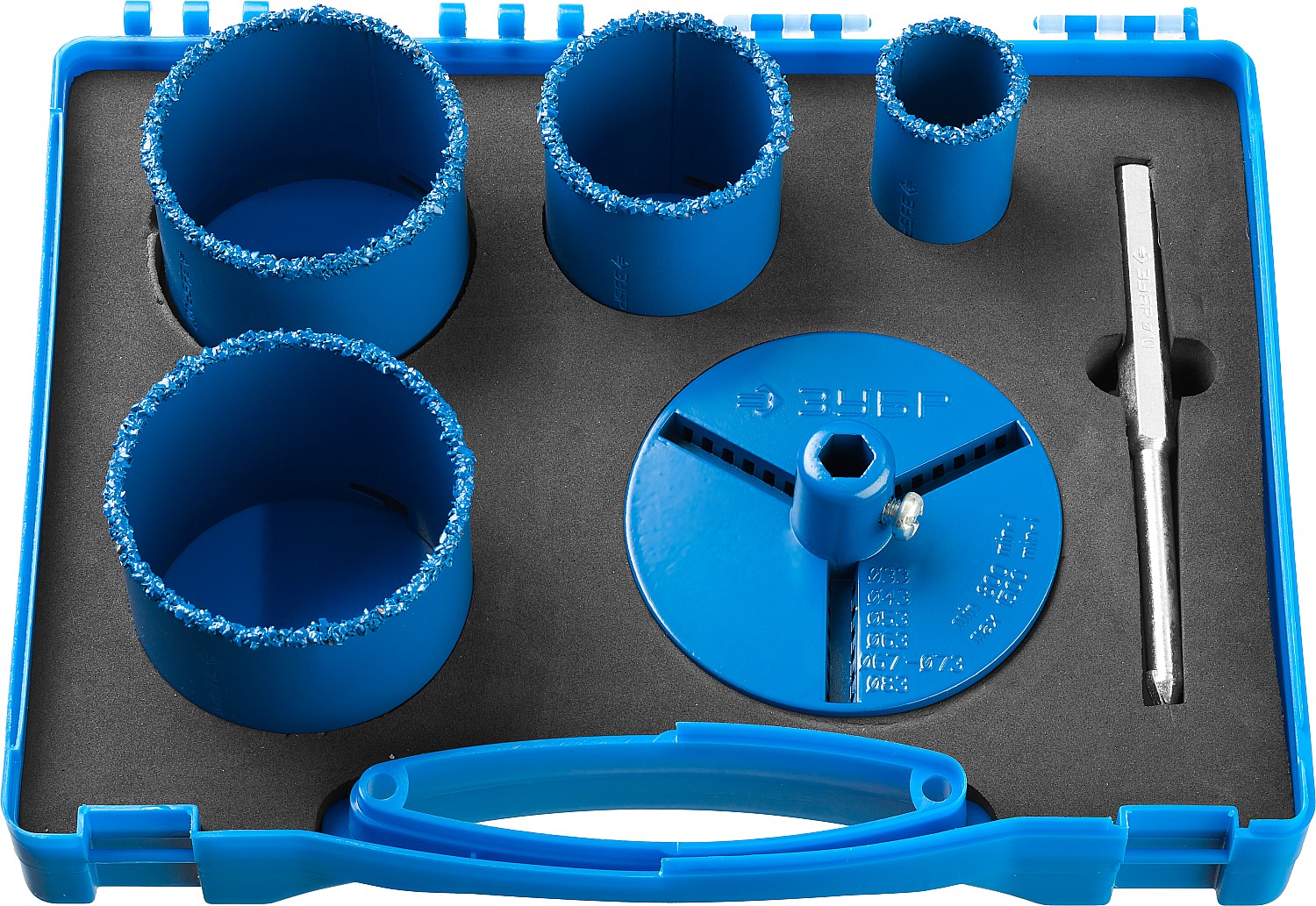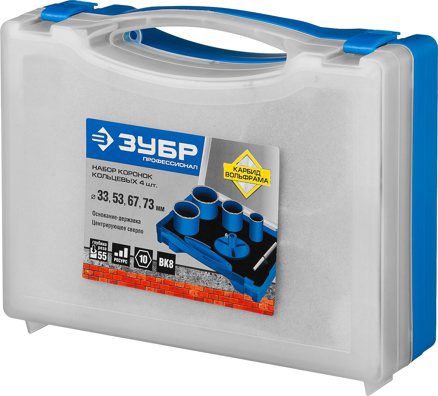 Комплектация6 пр.: коронки 33 - 53 - 67 - 73 мм, универсальное основание, центрирующее сверло