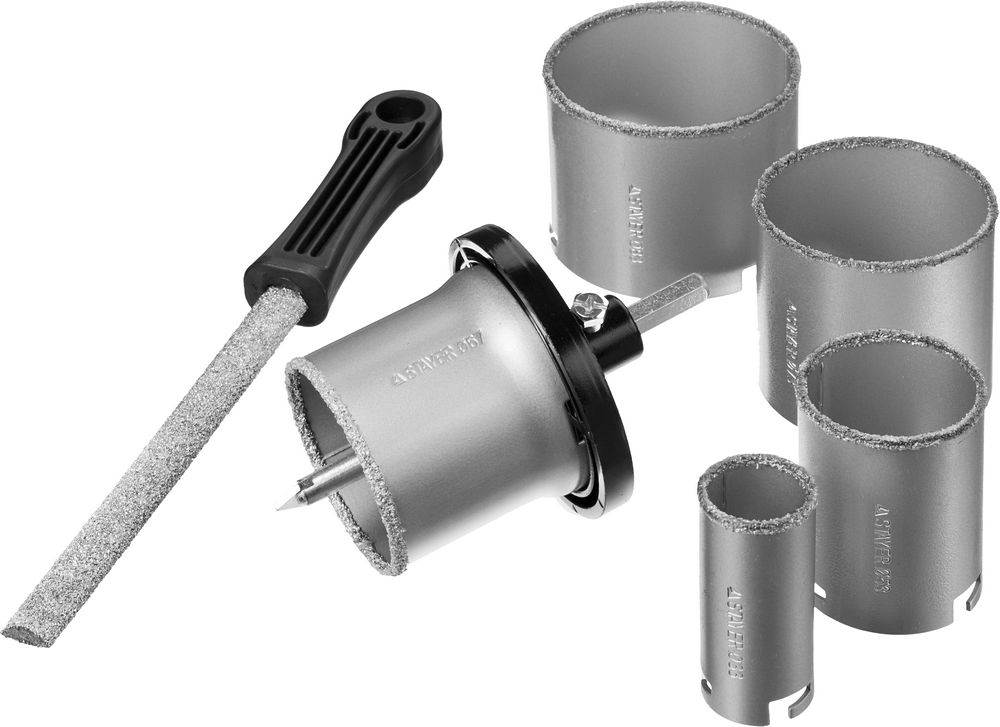 Набор применяется для получения ровных отверстий в облицовочных материалах, а также в ячеистом бетоне, кирпиче и гипсокартоне. Используется на дрелях и легких перфораторах в режиме безударного сверления.