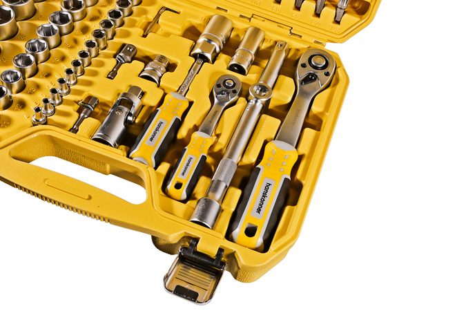 Трехкомпонентная рукоятка трещоток и отвертки обладает эргономичной формой, гарантируя надежный хват и комфортную работу с инструментом.