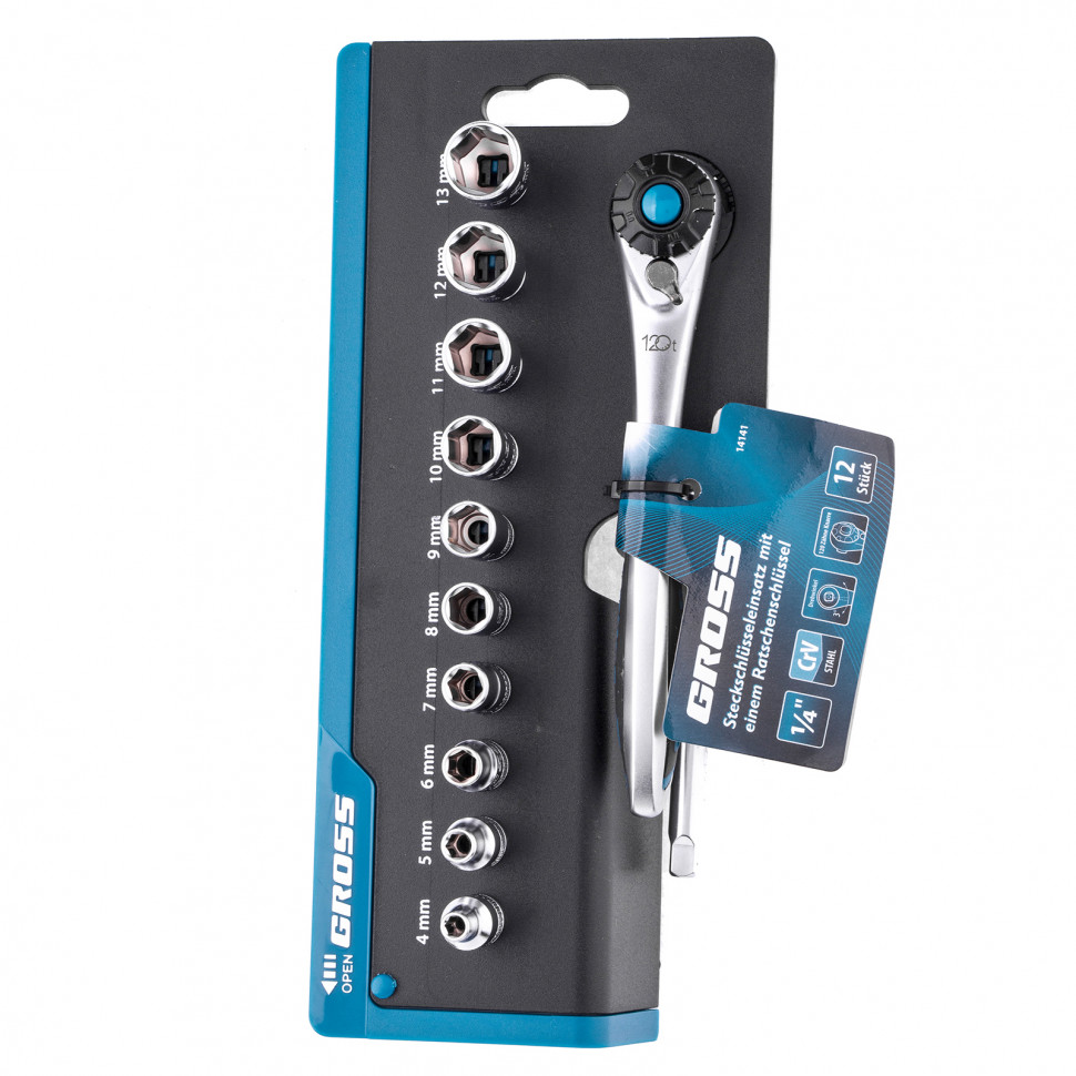 - Головки торцевые 1/4": 4, 5, 6, 7, 8, 9, 10, 11, 12, 13 мм