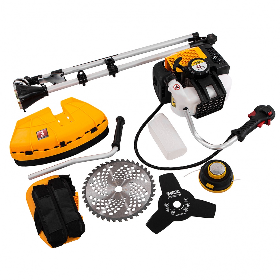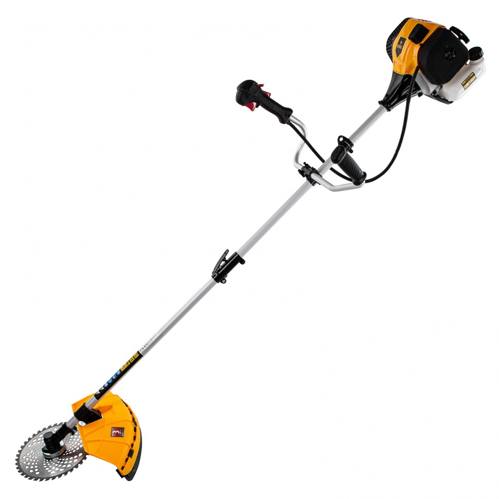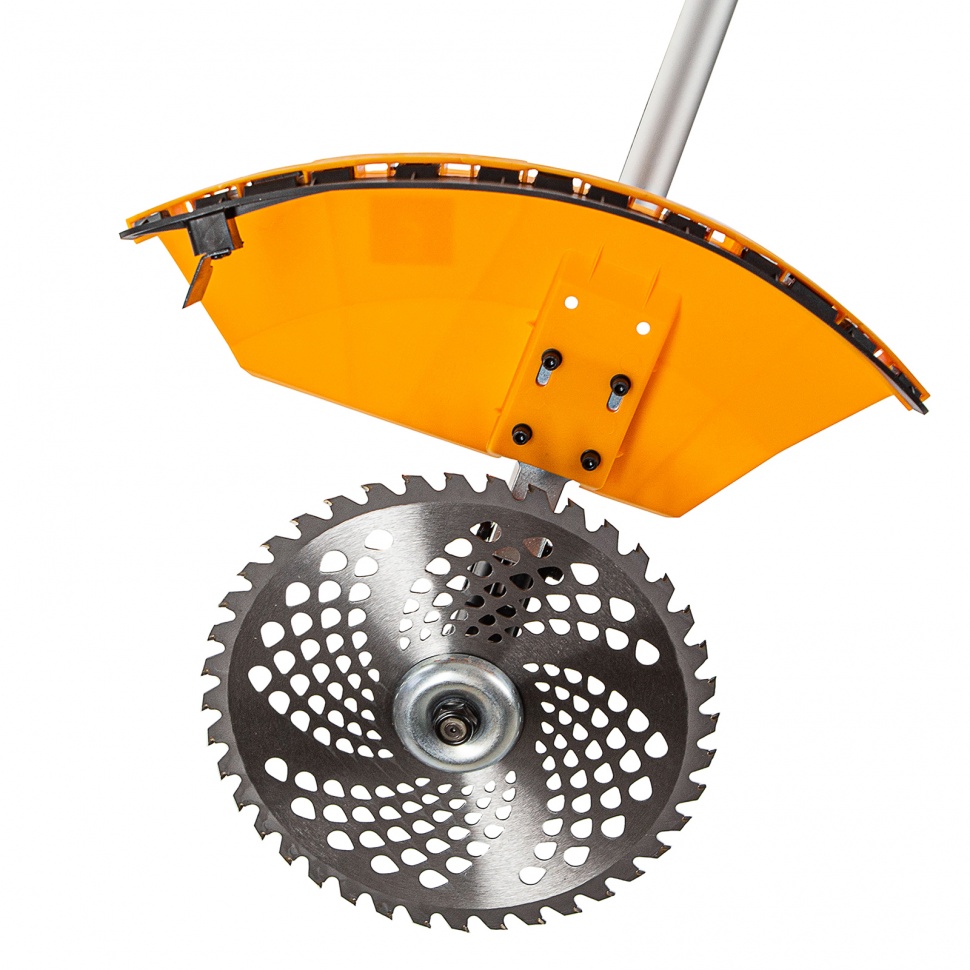 - В зависимости от рельефа местности и плотности растительного покрова предусмотрена быстрая замена режущего инструмента: стальной режущий диск, предназначенный для работы с жесткой травой и молодым кустарником, меняется на режущую полуавтоматическую триммерную катушку с леской для скашивания травы.