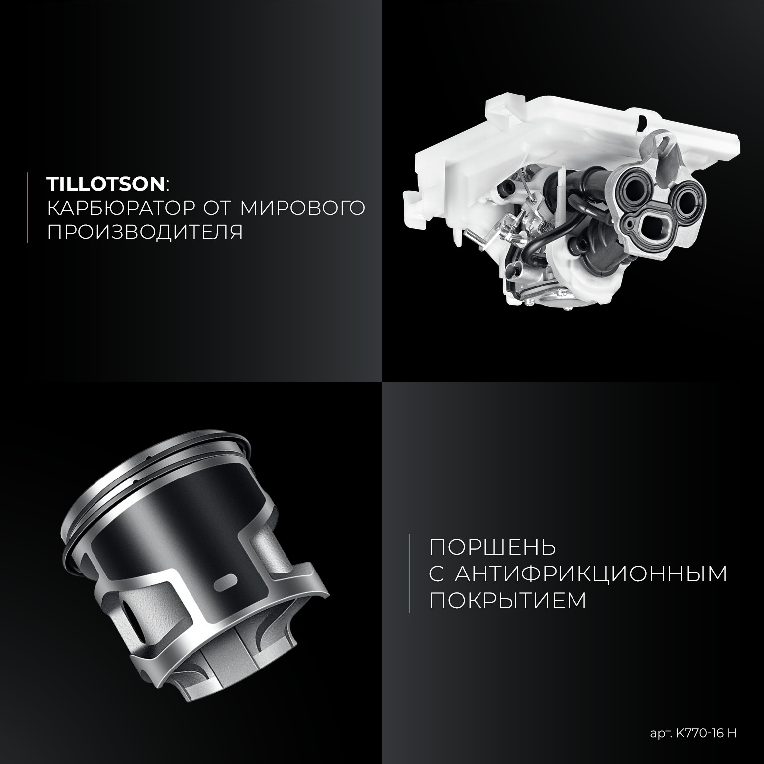 - Карбюратор TILLOTSON оснащен компенсационным клапаном, обеспечивающим высокую мощность даже при забитом воздушном фильтре