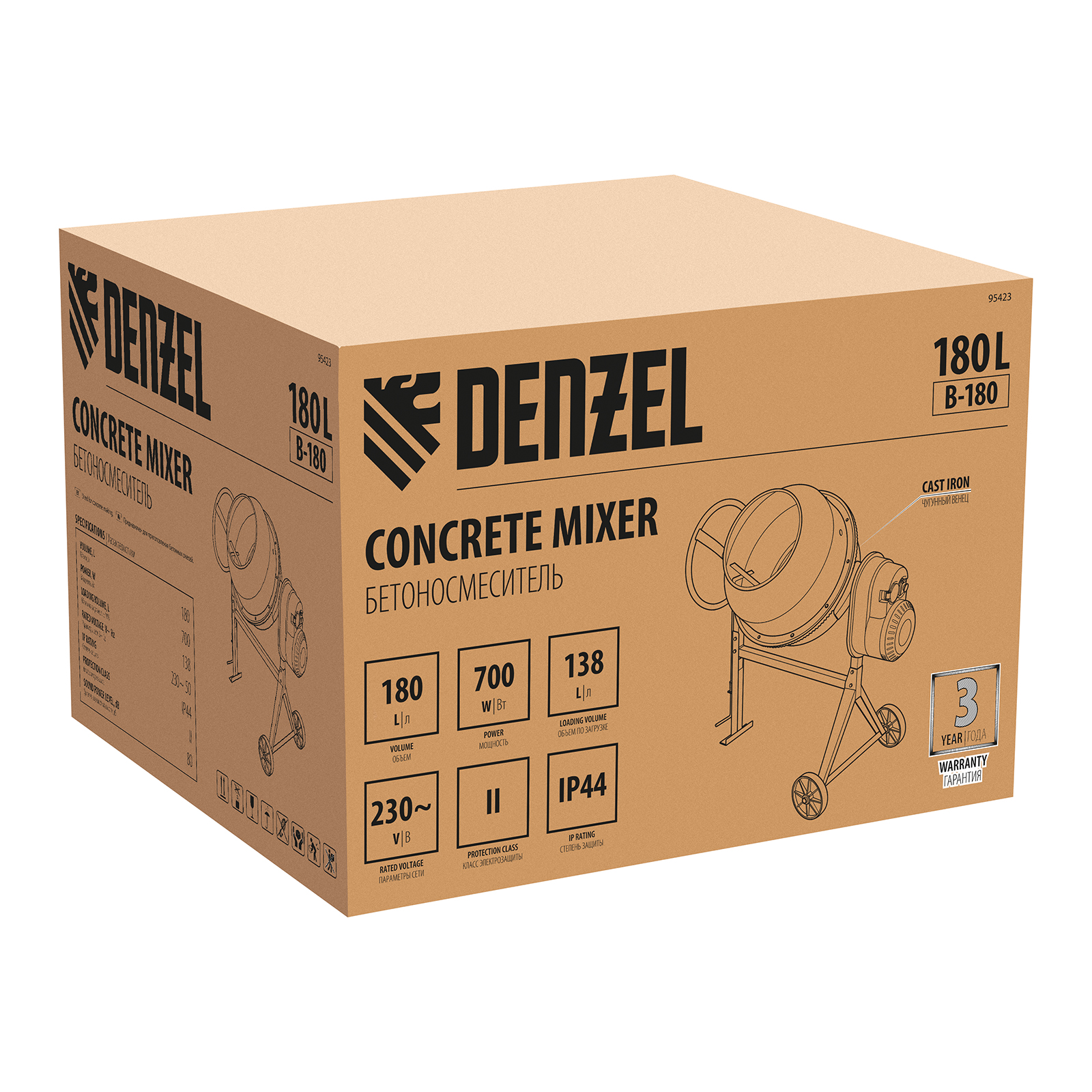 Бетоносмеситель Denzel B-180 95423 используется для приготовления раствора цемента, бетона или других смесей. Усиленная конструкция, оптимальное соотношение мощности двигателя 700 Вт и объема бака 180 л позволяют использовать устройство в режиме высокой нагрузки. Бетоносмеситель пригодится при проведении ремонтных работ и частном строительстве. Барабан объемом 180 л обеспечивает получение до 96 л готовой смеси (±10 %).