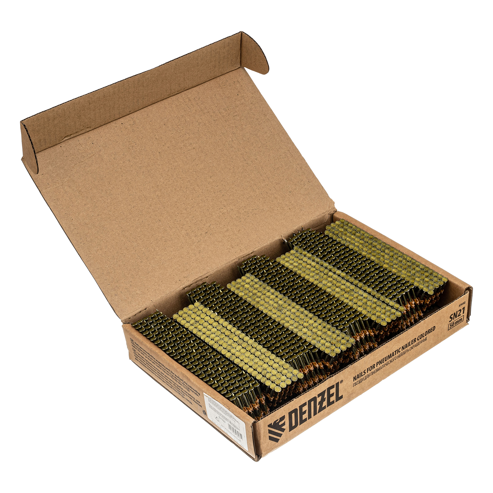 Гвозди Denzel 57692 типа SN21, длиной 50 мм и диаметром 2,9 мм, с крашеной поверхностью, 2000 шт. в упаковке, — расходники для пневматического нейлера. Используются для скрепления различных материалов, будут полезны во время сборочных и отделочных работ.
