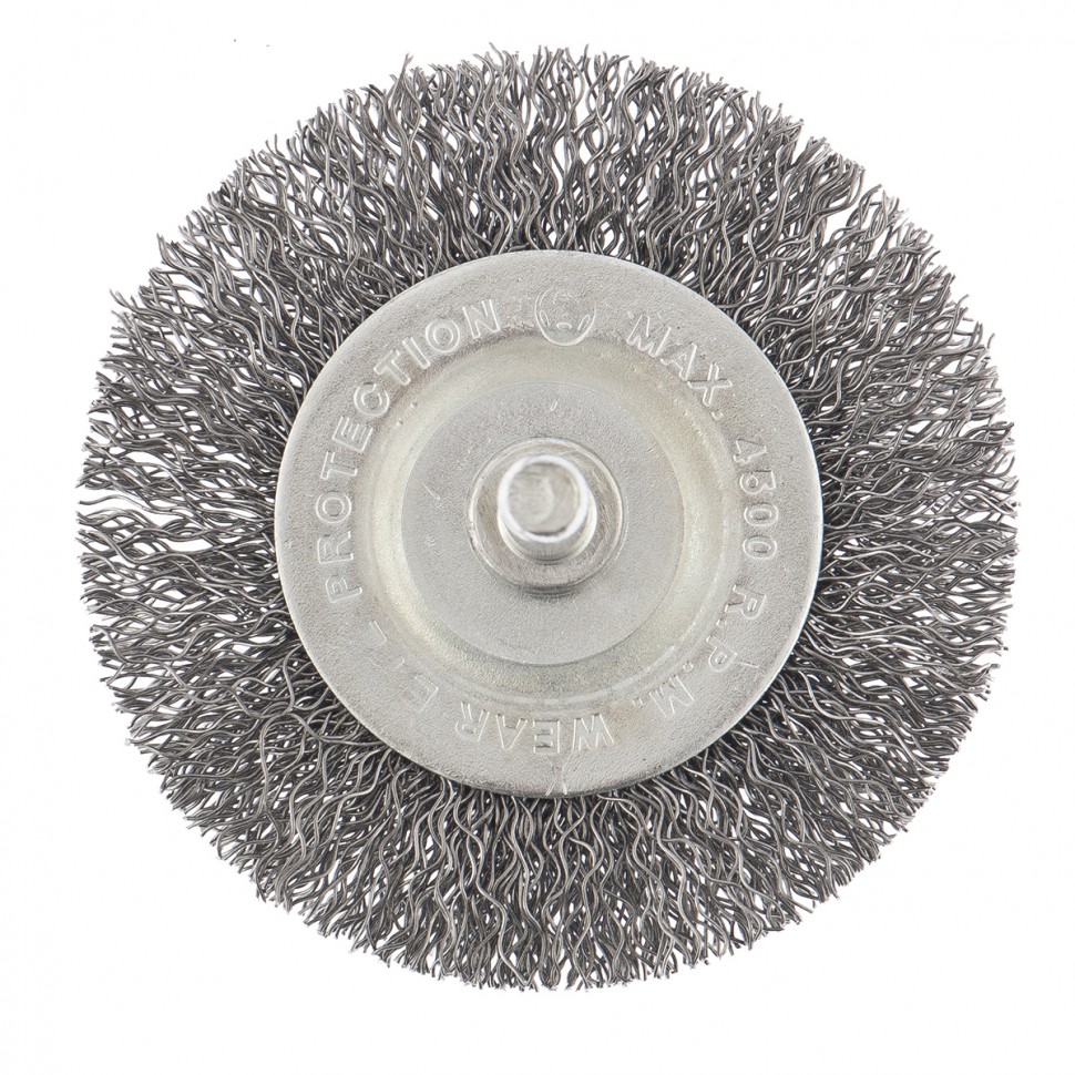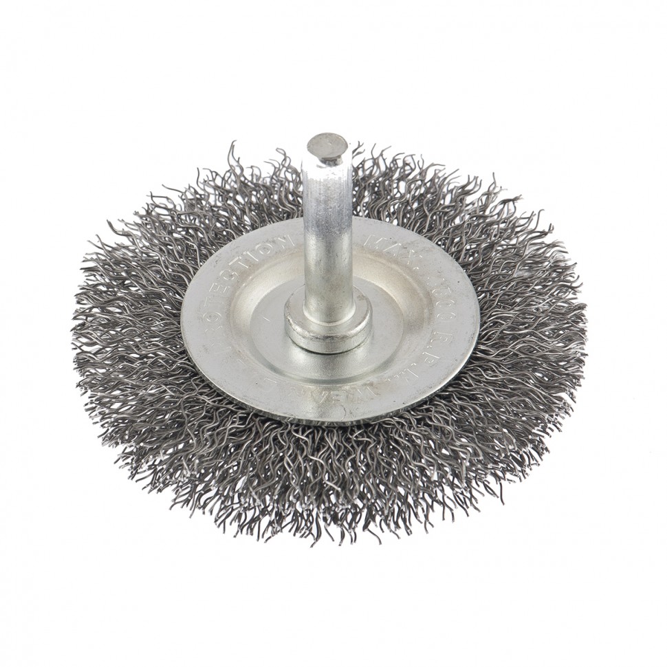 Плоская щетка для дрели Сибртех 744467 диаметром 60 мм, со шпилькой и щетиной из витой проволоки 0,3 мм, используется для щадящей обработки металлических, деревянных и пластиковых поверхностей. Удаляет загрязнения, ржавчину, старые лакокрасочные покрытия. Благодаря плоской форме щетка идеально подходит для очистки труднодоступных мест, пазов, изгибов, внутренних углов. Хвостовик диаметром 6 мм устанавливается в патрон дрели. Рекомендуемая скорость вращения 4500 об/мин. Во время работы следует использовать средства индивидуальной защиты. Щетку применяют во время строительства, ремонта, а также в быту.