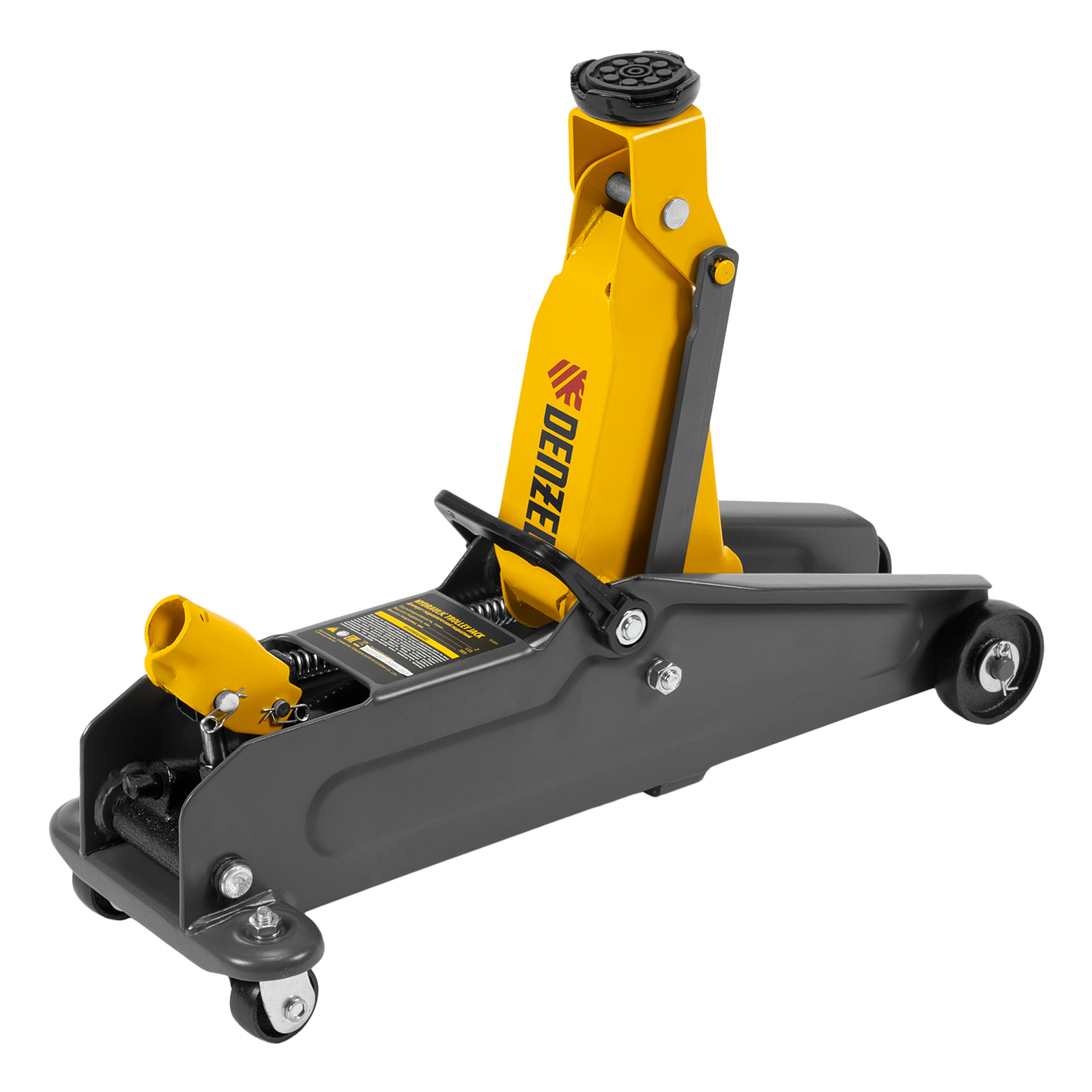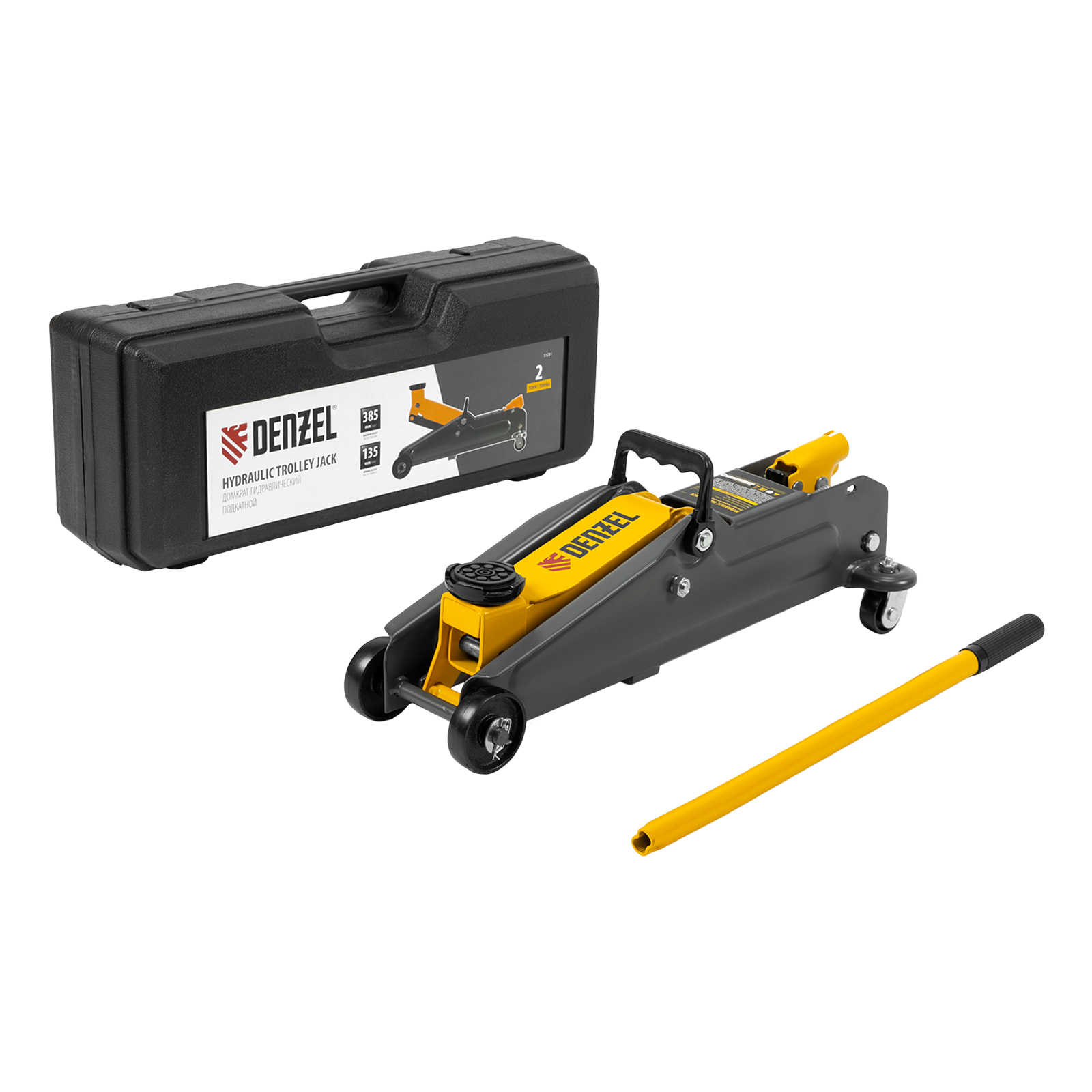 Гидравлический подкатной домкрат Denzel 51231 с высотой подхвата 135 мм, поставляющийся в пластиковом кейсе, предназначен для плавного подъема грузов массой до 2 т на высоту до 385 мм. Домкрат пригодится владельцам легковых автомобилей со стандартным клиренсом.