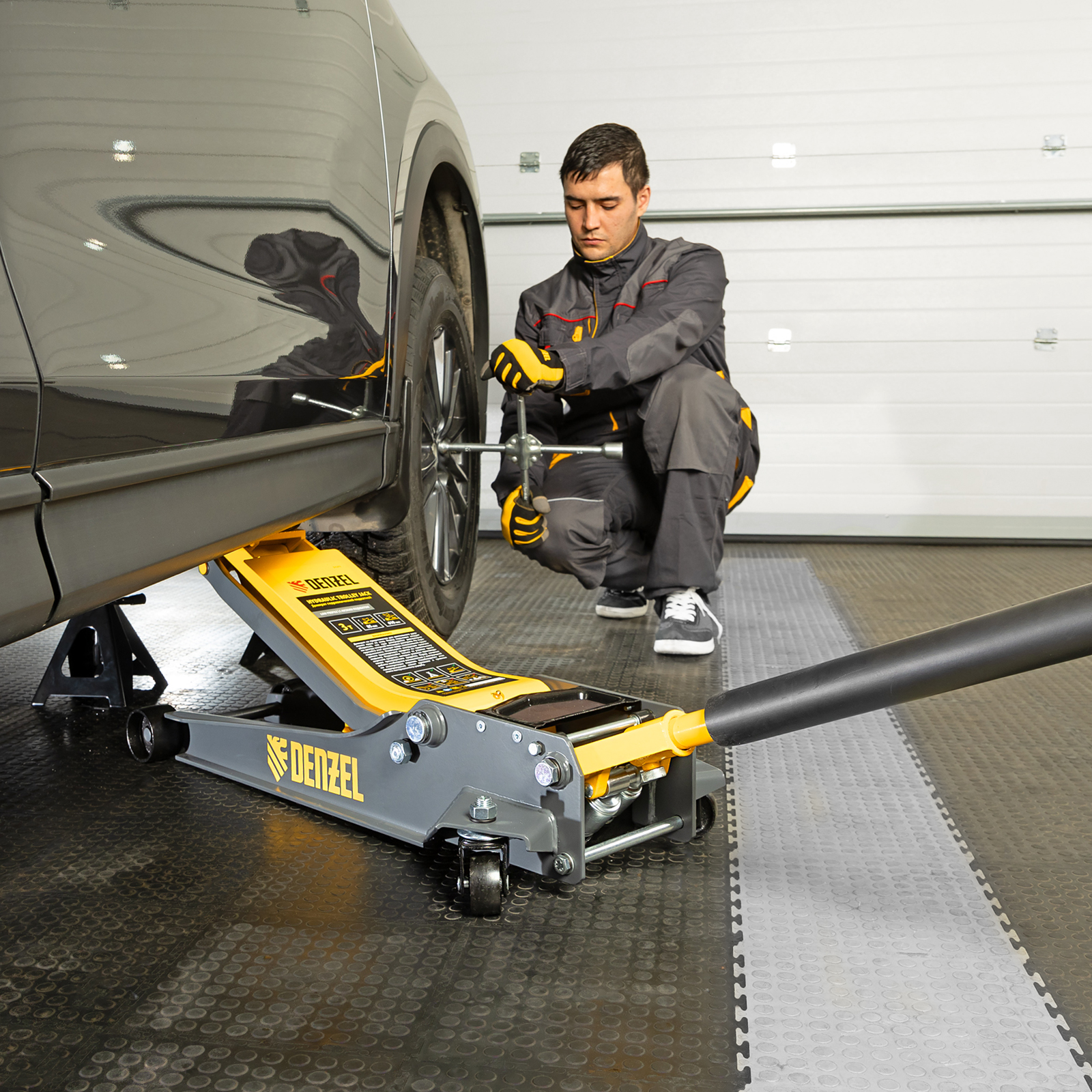 - Аккуратная работа — резиновая опора и прорезиненная рукоятка защищают кузов и днище автомобиля от нежелательных повреждений.