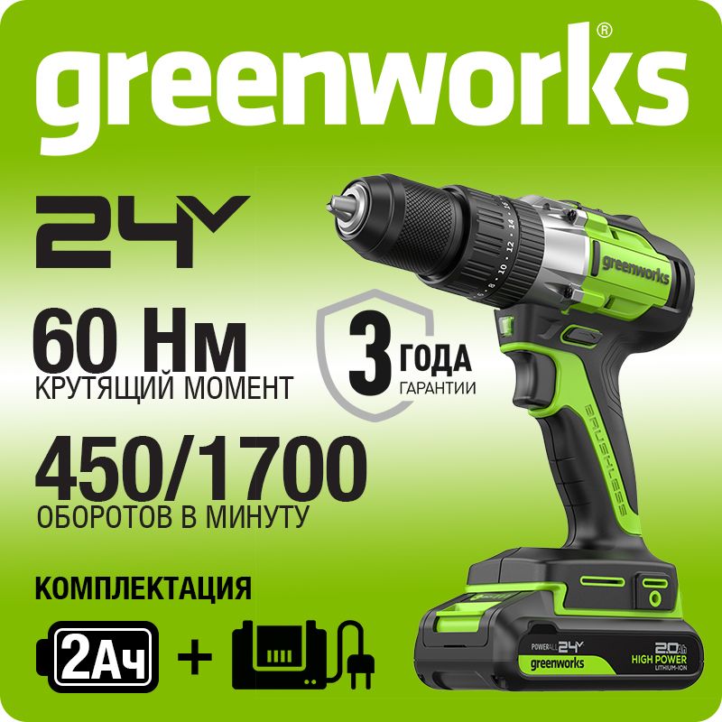 Дрель-шуруповерт ударная акк. Greenworks GD24DD60, 24V, б/щет, 0-450 / 0-1700 об/мин, 30/60Нм,1х2Ач,ЗУ,кор (3704107CUA) Ударная дрель-шуруповерт Greenworks GD24DD60, с тремя рабочими режимами для работ в мастерской или на стройплощадке: сверление с ударом (ударная дрель), сверление без удара и заворачивание/отворачивание метизов.