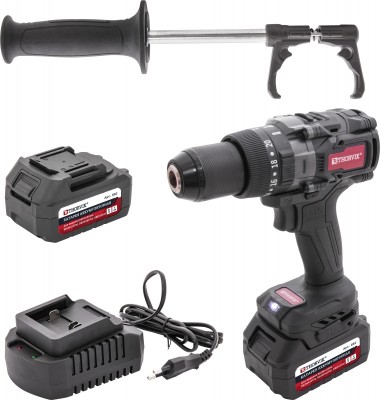 Ударная дрель-шуруповерт с самозажимным патроном до 13 мм, ударным механизмом и максимальным усилием затяжки резьбовых соедтинений до 160 Нм. Ударопрочная рукоятка с полимерными бензо-маслостойкими вставками и дополнительная удлиненная рукоятка с антивибрационным покрытием. Блок управления скоростями и автостопом со световой индикацией. Литий-ионная аккумуляторная батарея с индикацией заряда.