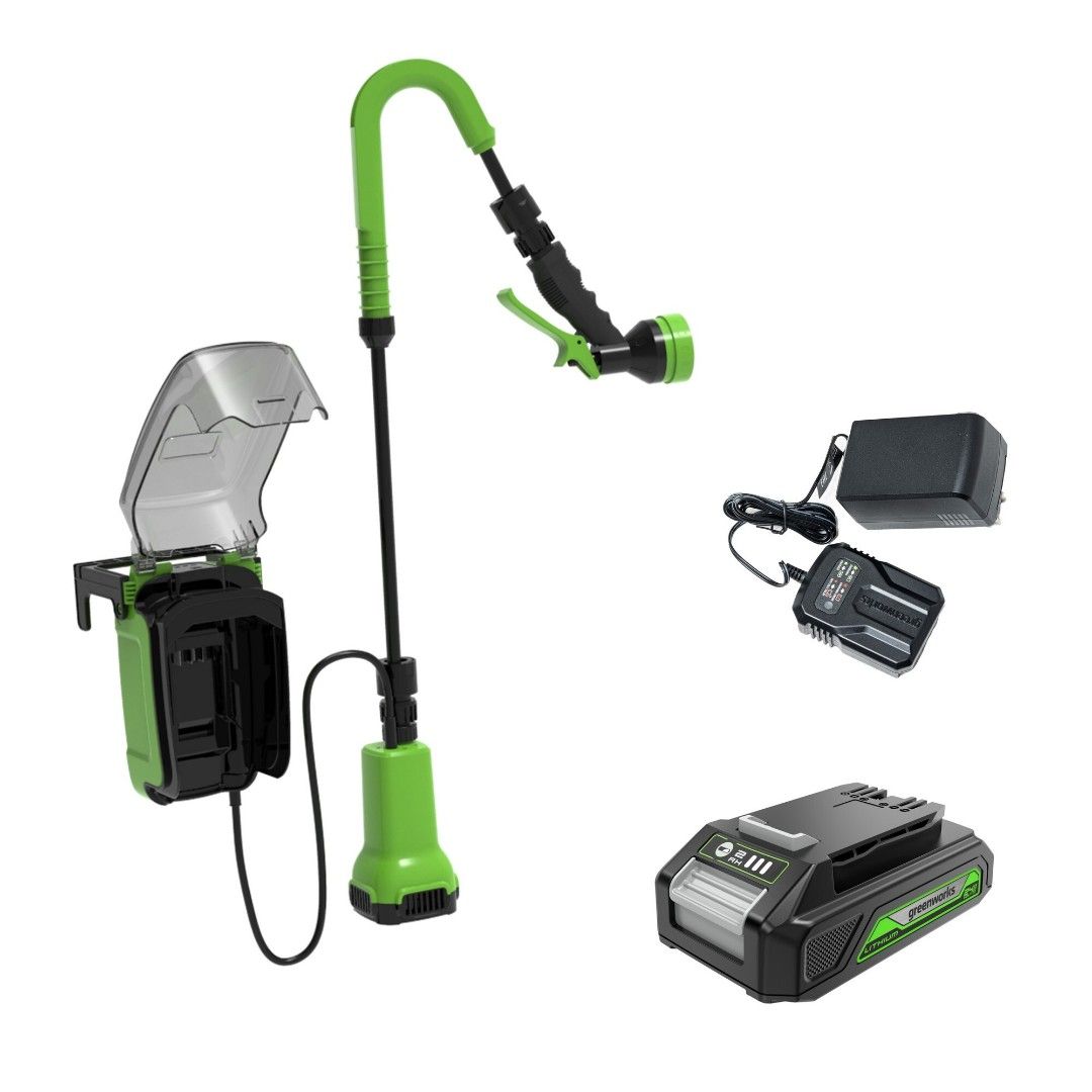 - С аккумуляторным насосом Greenworks G24SWP 3401007 любые работы по поливу сада или огорода могут выполняться быстро и легко, без использования водопровода или электричества.