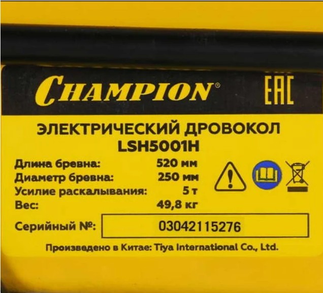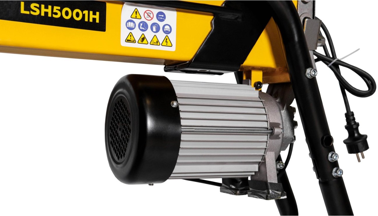 Дровокол электрический Champion LSH5001H оснащен асинхронным двигателем мощностью в 2,2 кВт, который позволяет значительно ускорить процесс колки дров. Время одного цикла нагрузки составляет 10 минут. Это означает, что время работы при постоянной нагрузке составляет 4 минуты, затем остановка на 6 минут. Напряжение, необходимое для работы дровокола составляет 230 Вт.