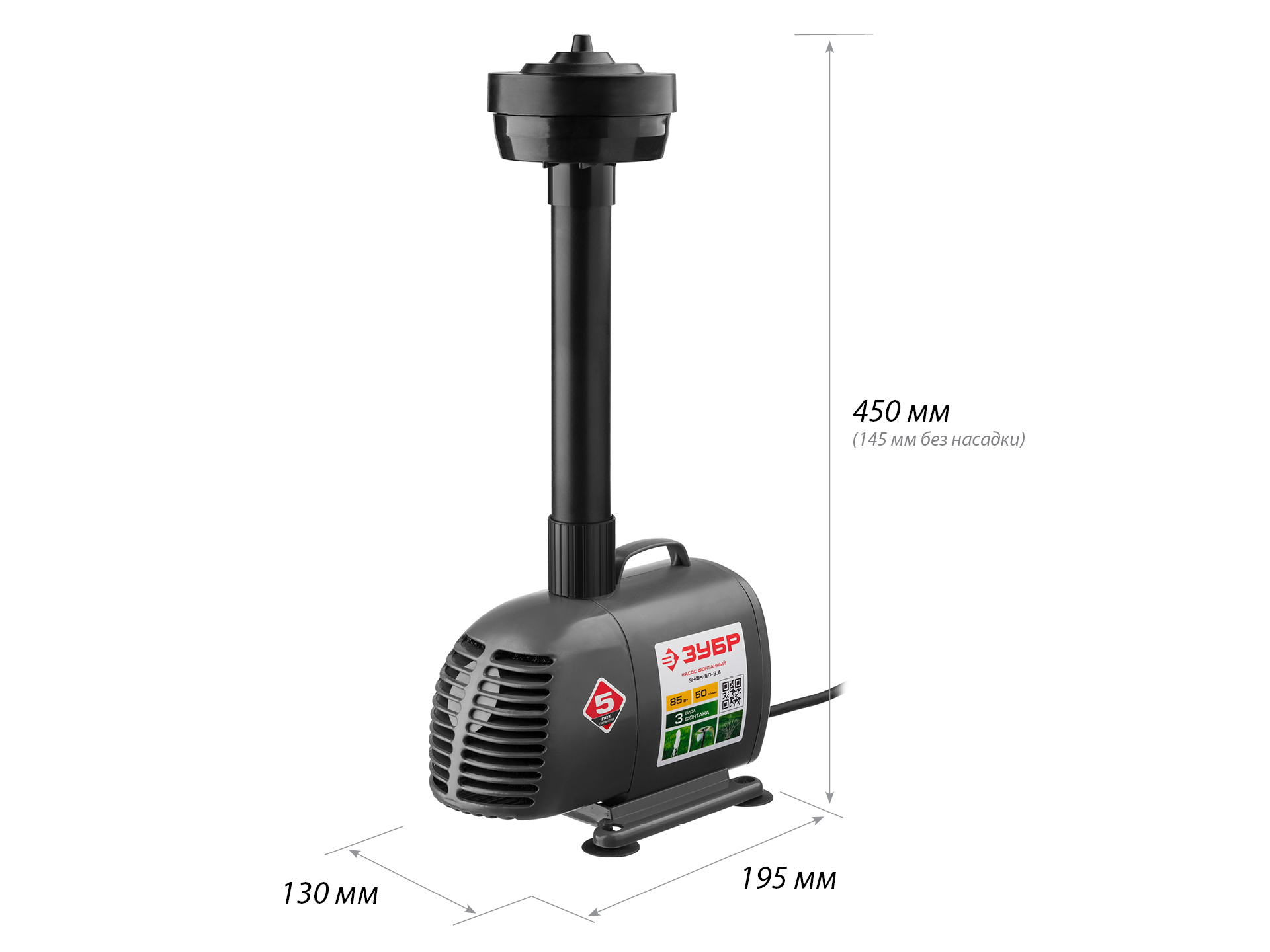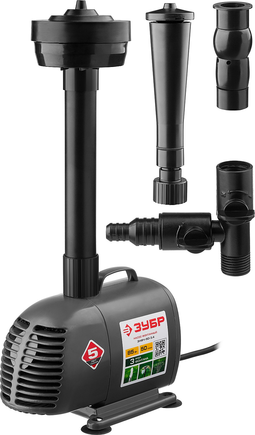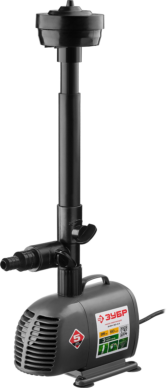Насос фонтанный, ЗУБР ЗНФЧ-50-3.4, для чистой воды, напор 3,4 м, насадки: колокольчик, гейзер, каска