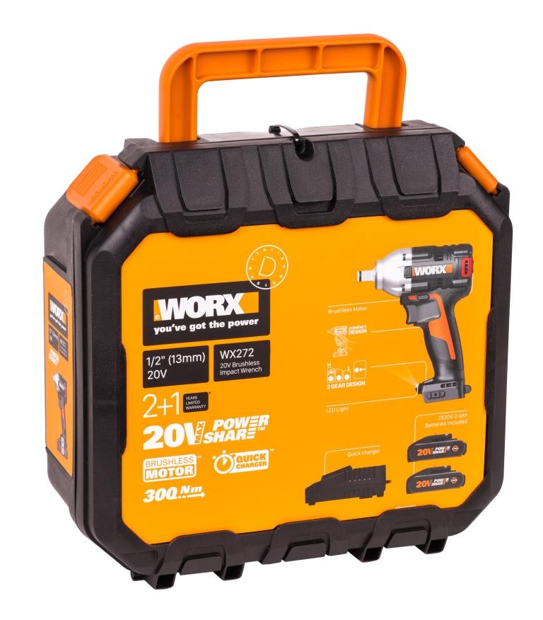 Бесщеточный гайковерт WORX WX272 подойдет для самостоятельной замены колесных дисков, а также проведения строительных или бытовых работ. Ударный аккумуляторный гайковерт WX272 обладает оптимальным балансом веса и мощности. У инструмента есть 3 режима скорости работы, отличающихся крутящим моментом: 100, 180 и 300Нм. Бесщеточный двигатель увеличивает крутящий момент гайковерта на 25% и продлевает ресурс инструмента до 50%. В сравнении с обычным двигателем, бесщеточная конструкция меньше нагревается и создает минимум шума при работе. Компактный гайковерт поставляется в удобном транспортировочном кейсе, что позволяет легко взять его с собой. Вес укомплектованного инструмента составляет всего 3кг. Гайковерт имеет 3 скоростных режима с максимальным крутящим моментом 300Hm и легко адаптируется под разные задачи. В комплект поставки инструмента входят сразу 2 универсальных аккумулятора 20В. Работайте со вторым аккумулятором, пока разряженная батарея восстановит емкость. Вместе с гайковертом вы также получаете быстрое зарядное устройство. Универсальное крепление типа “квадрат” с патроном ½ дюйма позволяет легко подобрать оснастку под ваши потребности. Современная система фиксации ускоряет процесс замены бит, что дает возможность быстро подготовить инструмент к работе. Технические характеристикиТип двигателя: Бесщеточный. Напряжение аккумулятора: 20 В. Емкость аккумулятора: 2 А*ч. Тип аккумулятора: Li-lon. Количество аккумуляторов в комплекте: 2. Размер патрона: 1/2 дюйма Тип патрона: квадрат с отверстием и фрикционным кольцом Max крутящий момент: 300 Нм. Частота вращения шпинделя: 0-1300/2200/2900 об/мин. Частота ударов: 0-2000/3200/4000 уд/мин Число скоростей: 3. Наличие удара: есть. Наличие подсветки: есть. Вес устройства без АКБ: 1,7 кг.