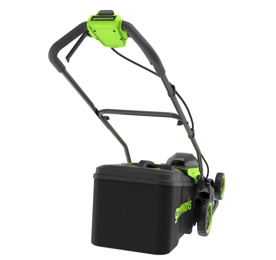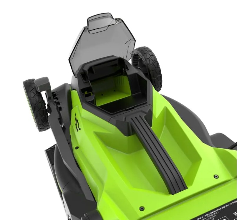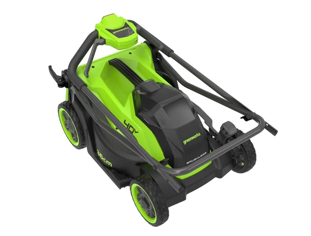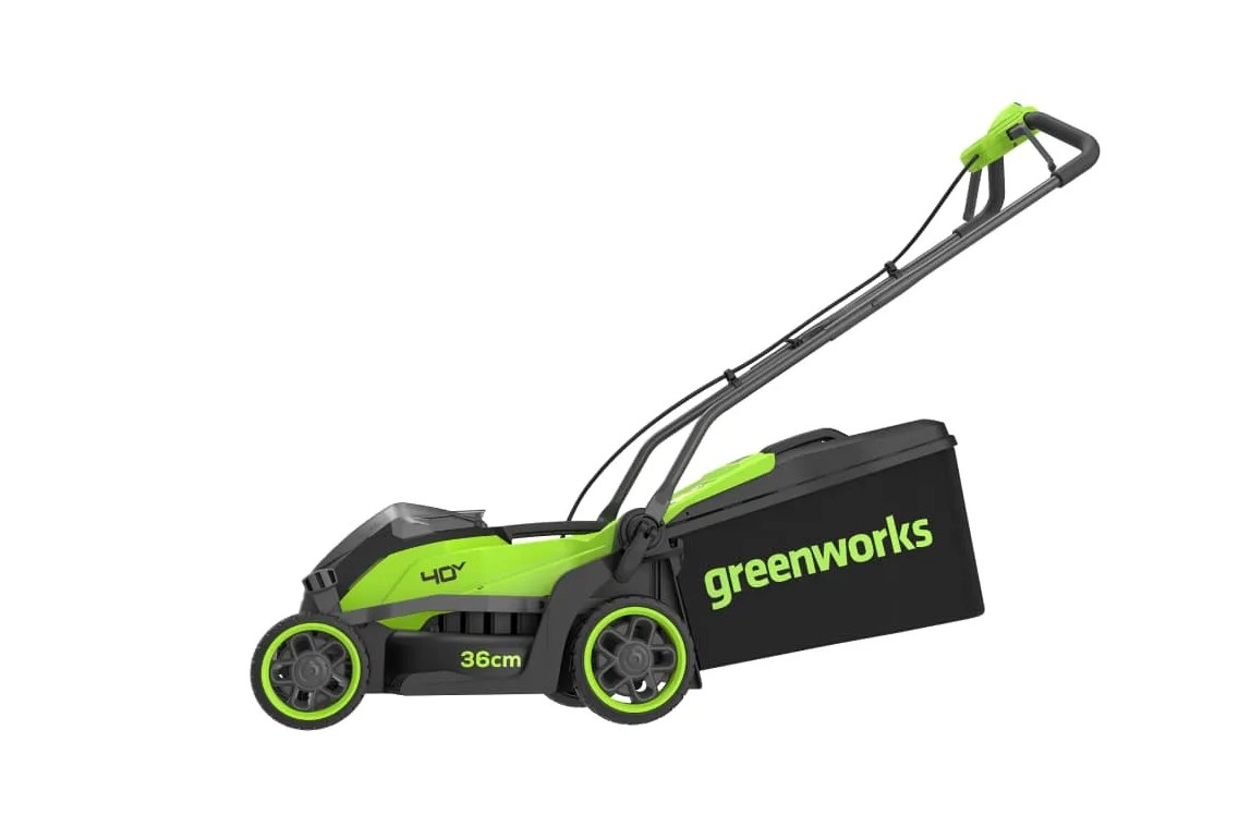 Газонокосилка аккумуляторная Greenworks GD40LM361, 40V, 36 см, бесщеточная, без АКБ и ЗУ (2520807). Модель 2025 года с обновленным характеристиками и дизайном: увеличенная мощность, комбинированный травосборник с жесткой верхней частью с индикатором заполнения и мягкой складной нижней частью для удобства хранения, новая эргономичная конструкция выключателя, новые стильные колеса.