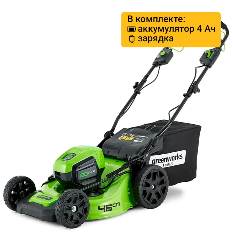 Газонокосилка аккумуляторная Greenworks GD60LM46SPK4, 60V, 46 см, самоход, бесщ, с 1хАКБ 4 Ач и ЗУ