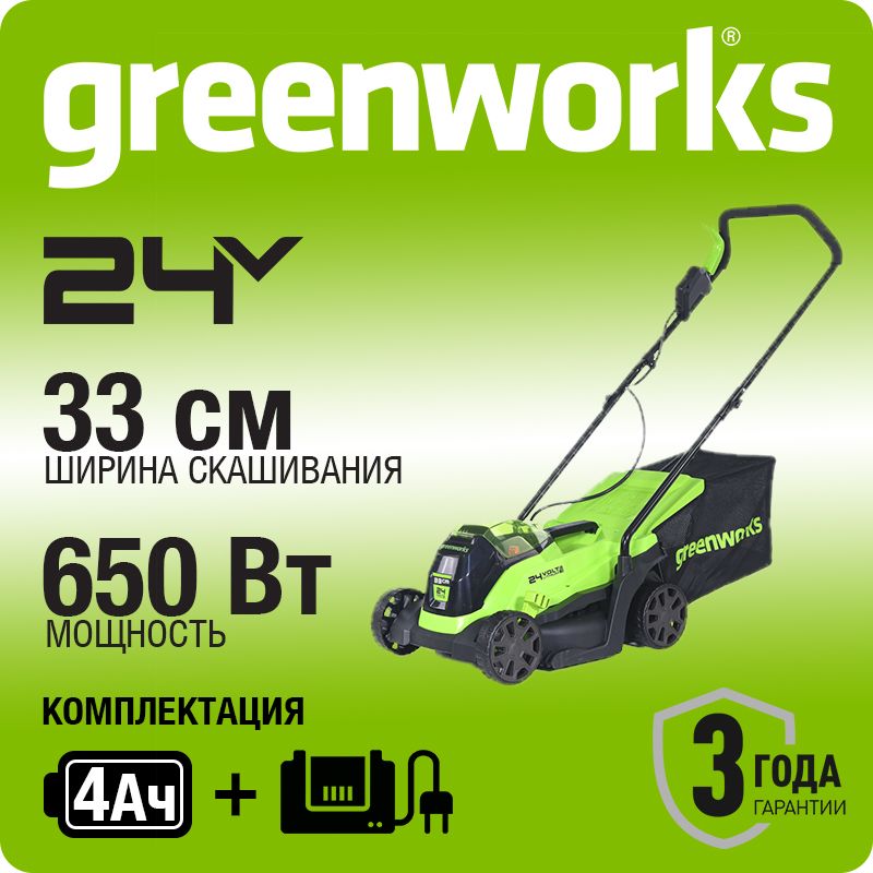 Газонокосилка аккумуляторная Greenworks Арт. 2516107UB, 24V, 33 см, бесщеточная, с 1хАКБ 4Ач и ЗУ