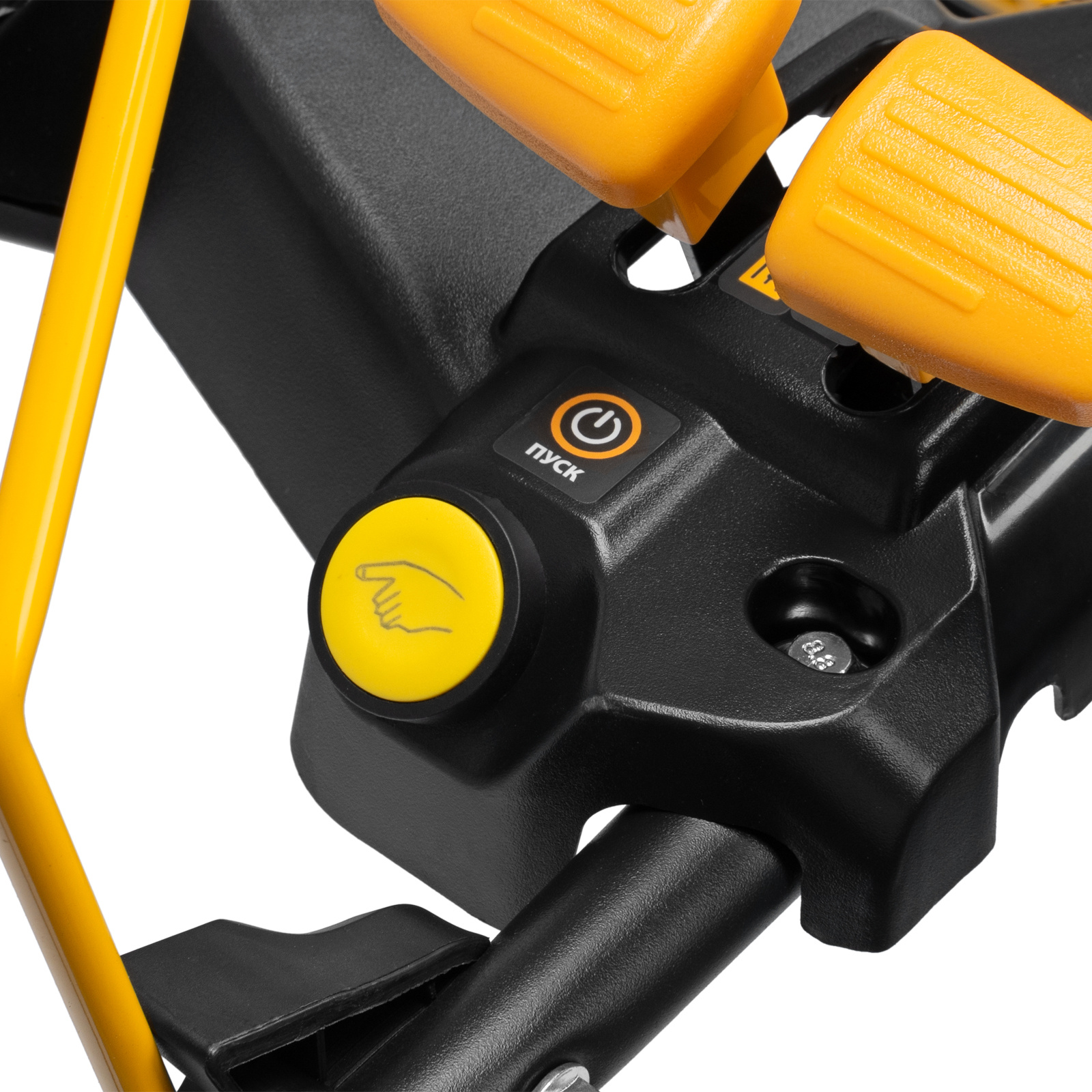- Регулировка скорости вращения двигателя — запуск и маневрирование происходят на низких оборотах, скашивание — на высоких, что позволяет выполнять работу аккуратно и не снижать производительность.
