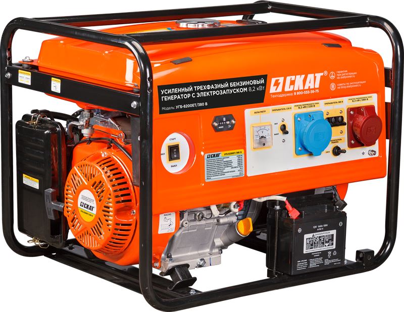 Бензиновый генератор СКАТ УГБ-8200ЕТ мощностью 8,2 кВт обеспечит энергией дачу, коттедж или фермерское хозяйство и станет отличным помощником для горнопромышленников, лесозаготовителей, выездных ремонтных бригад или владельцев мобильного бизнеса.