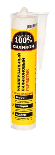 Силиконовый герметик «Ремонт на 100%» — однокомпонентный универсальный состав кислотного типа, предназначенный для профессиональных и бытовых работ внутри и снаружи помещений. Продукт обеспечивает герметизацию подвижных швов, трещин и щелей на поверхностях из стекла, пластика, керамики, дерева, алюминия, кирпича, окрашенного металла и других материалов. Благодаря высокой эластичности и тиксотропным свойствам (не растекается) герметик формирует прочное, устойчивое к деформациям покрытие.