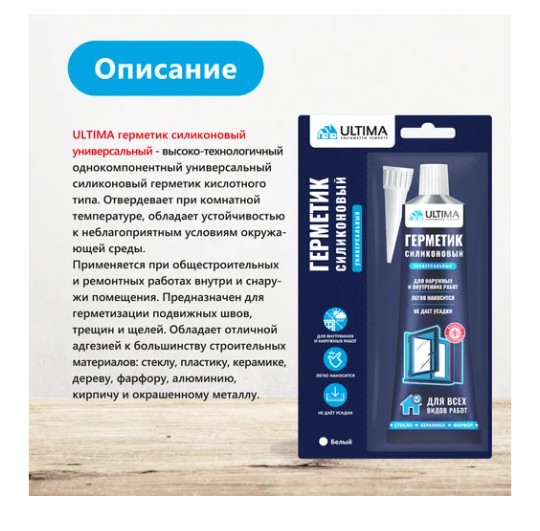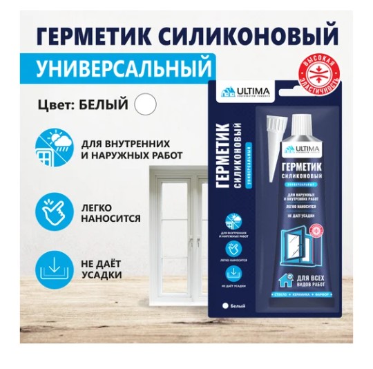 Герметик силиконовый универсальный ULTIMA белый 80 мл UYVDN80106 - кислотный силиконовый герметик для широкого спектра строительных и общих ремонтных работ. Обладает отличной адгезией к стеклу, дереву, керамике. Подходит для внутренних и наружных работ.