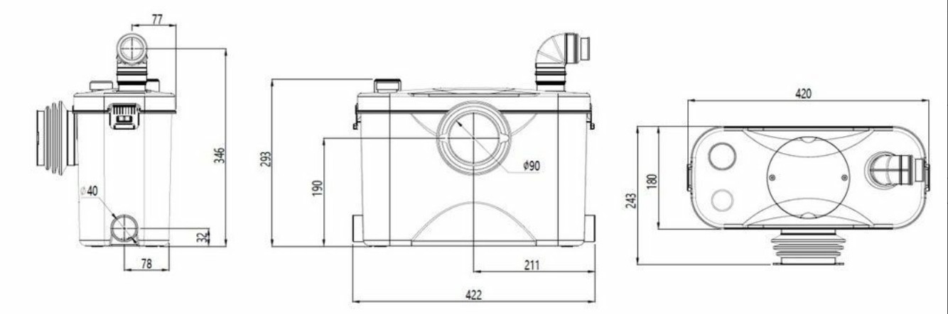 - Один вход (Ø 100 мм) — для присоединения к унитазу, два входа (Ø 40 мм) — для присоединения раковины и душевой кабины, один дополнительный вход (Ø 40 мм) - закрыт заглушкой и используется при необходимости. Отвод в канализацию через выходное отверстие (Ø 23/28/32/44 мм)