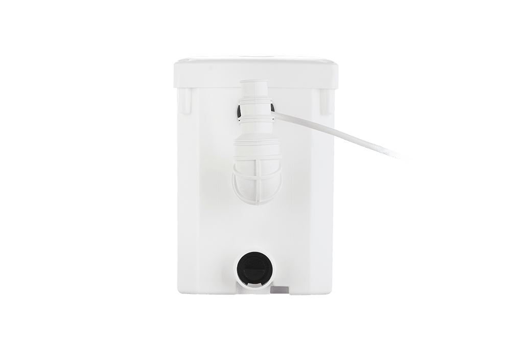 Корпус канализационной станции выполнен из легко моющегося пластика. Внутри корпуса установлен фекальный насос с измельчителем. Канализационная насосная станция имеет три входа: один вход (Ø 100 мм) — для присоединения к унитазу, и два входа (Ø 40 мм) — для присоединения раковины и душевой кабины. Сточные воды отводятся в канализацию через выходное отверстие (Ø 23/28/32 мм). Обратный клапан, установленный на выходе канализационной станции, предотвращает возврат откаченной воды в станцию. Встроенный датчик давления автоматически включает и выключает насос.