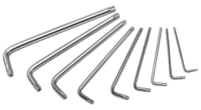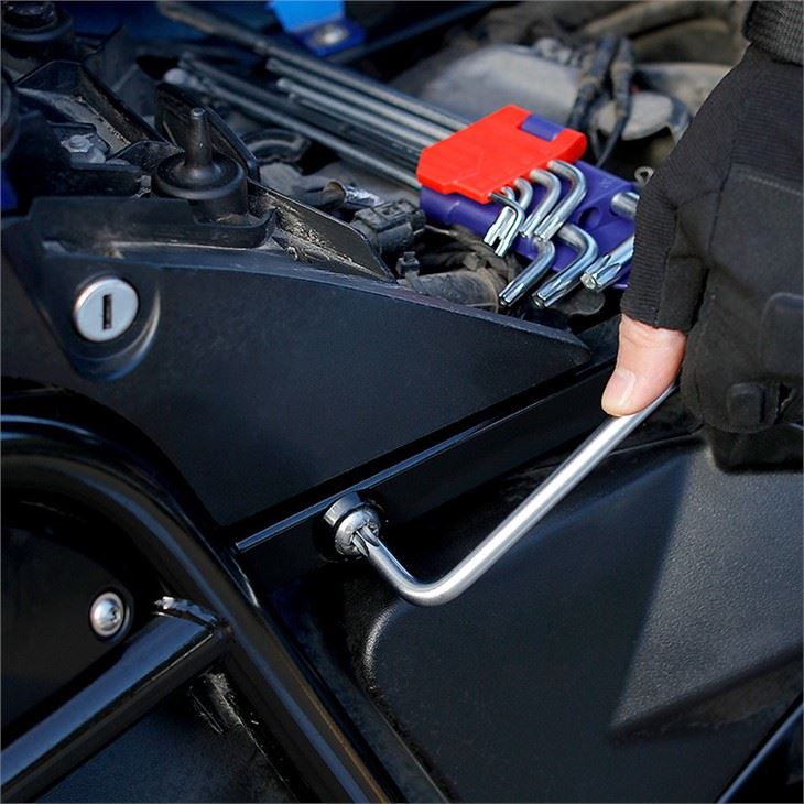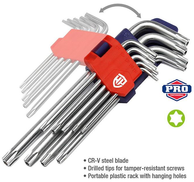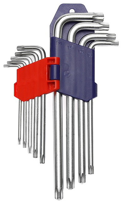 Набор Г-образных ключей WORKPRO 9шт TORX с отверстием WP222002 выполнен из высокопрочной стали, имеет изгиб под прямым углом - без риска деформации при вращении.