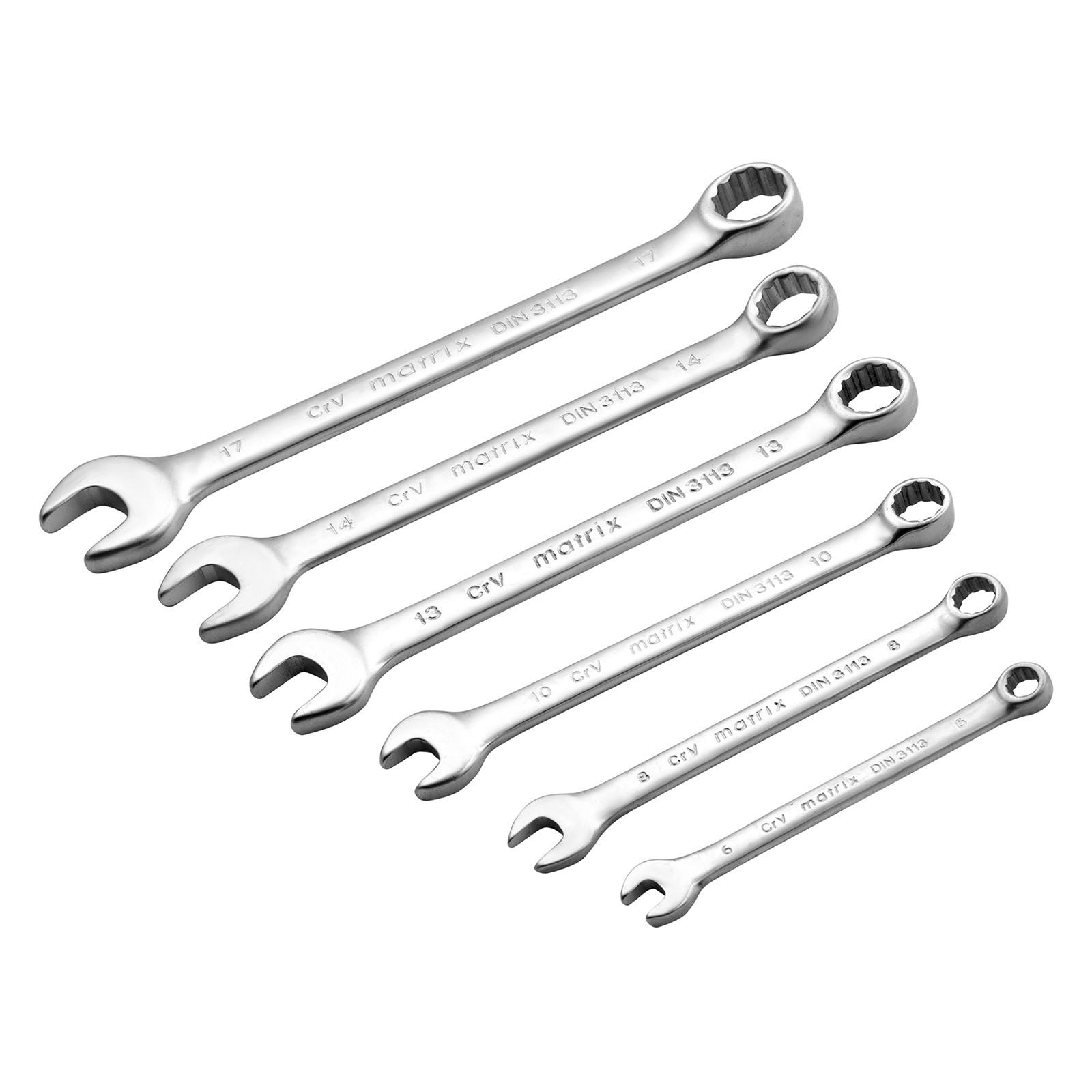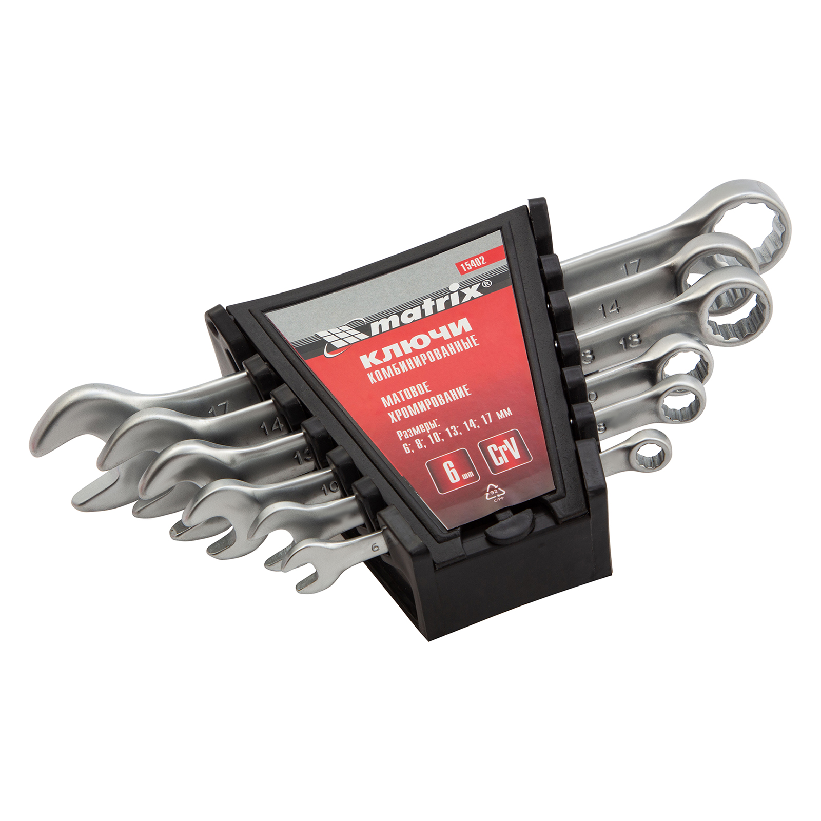 Набор Matrix 15402 включает 6 комбинированных ключей из стали CrV, размером 6-17 мм, с покрытием «матовый хром», которые пригодятся во время ремонтных работ дома или в гараже. С их помощью можно быстро монтировать и демонтировать крепежные элементы. В набор входят инструменты основных типоразмеров, позволяющие эффективно решать поставленные задачи.