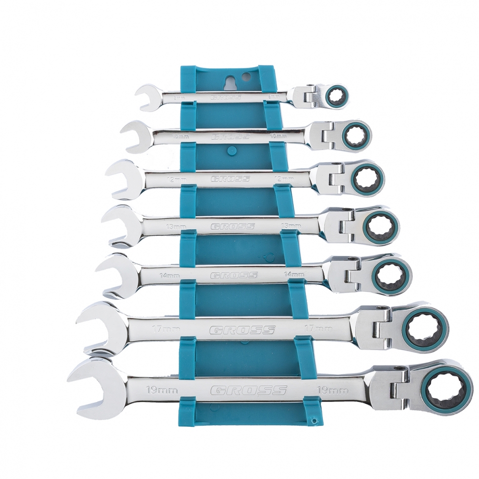 Набор комбинированных ключей торговой марки GROSS предназначен для монтажа/демонтажа резьбовых соединений. Ключи набора изготовлены из высококачественной хромованадиевой (Crv) стали. В набор входит семь ключей размером от 8 до 19 мм. Каждый ключ с одной стороны оснащен захватом открытого типа — рожковым и накидным (кольцевым) с другой стороны. Сторона с накидным типом захвата оборудована храповым механизмом, который позволяет проводить быстрый монтаж резьбовых соединений. Хромоникелевое покрытие ключей улучшает антикоррозийные свойства инструмента.
