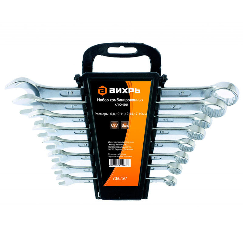 Набор комбинированных ключей ВИХРЬ включает 8 гаечных ключей, изготовленных из качественной стали. Применяются для работ с шестигранным крепежом.