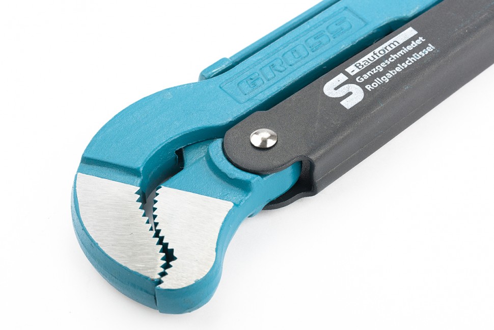 Ключ трубный рычажный типа S усиленной конструкции, применяется при повышенных нагрузках. Предназначен для захватывания и вращения труб и соединительных частей трубопроводов. Изготовлен из высококачественной хромванадиевой стали. Имеет порошковое антикоррозийное покрытие. Губки дополнительно закалены токами высокой частоты до твердости 57–60 HRс. Прогрессивная форма зуба с наклоном против направления вращения обеспечивает самоблокируемый захват деталей. Верхняя ручка имеет выштампованный Т-образный профиль. Регулировочная гайка снабжена стопорным кольцом.