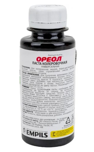 Универсальная колеровочная паста ОРЕОЛ черный (21), 100 мл 4783 предназначена для ручного колерования красок, эмалей, лаков, сухих строительных смесей, растворов, побелочных и других составов на водной и органической основе.