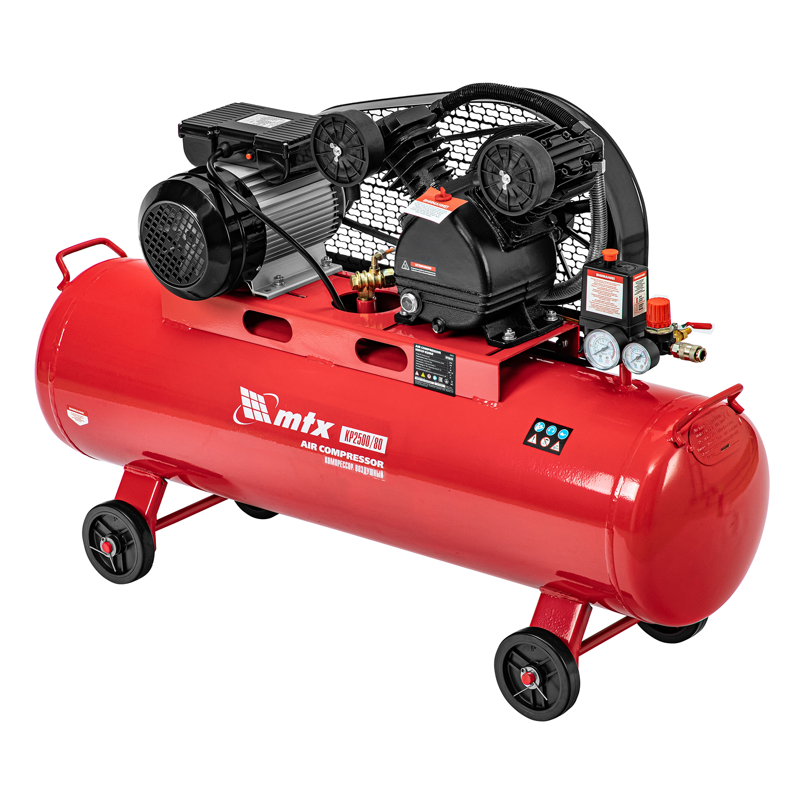 Компрессор воздушный МТХ КР2500/80 58022 с ременным приводом от электродвигателя, мощностью 2,5 кВт и производительностью 420 л/мин, с ресивером объемом 80 литров, применяется для подачи сжатого атмосферного воздуха к пневматическому инструменту. К нему можно подключить гайковерт, дрель, углошлифовальную машину, степлер, краскопульт, продувочный пистолет или другой пневмоинструмент. Для подключения предусмотрены 2 штуцера: быстросъемный и «елочка». Компрессор подходит для профессионального использования на предприятии автосервиса, строительной площадке, в мастерской.
