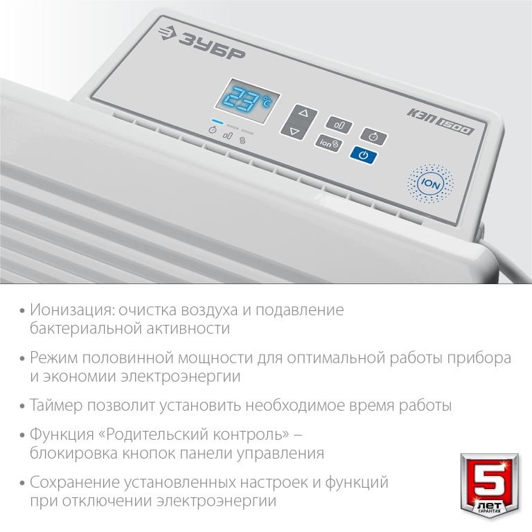 Электрический конвектор ЗУБР ПРОФЕССИОНАЛ мощностью 1500 Вт - подойдет для обогрева любых домашних и офисных помещений площадью до 20 м2. Электронный терморегулятор и ионизация воздуха обеспечит равномерный нагрев помещения и создаст неповторимую атмосферу комфорта.