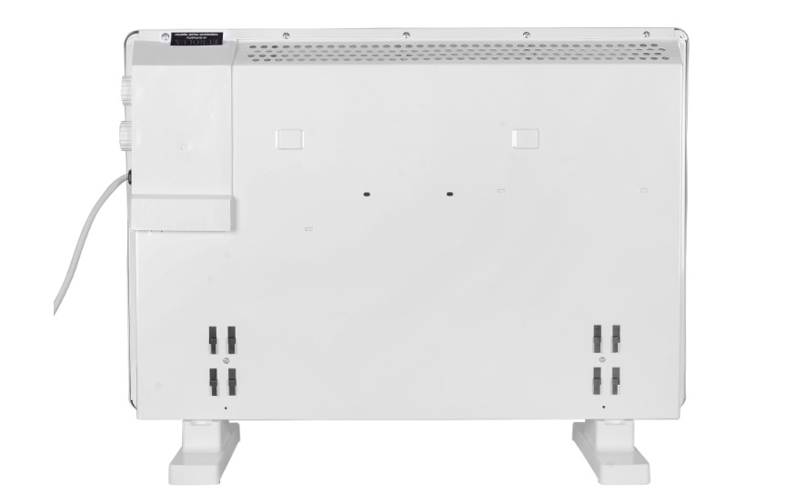 Корпус электроконвектора имеет плоскую форму с лаконичной передней панелью. Благодаря этому обогреватель хорошо смотрится при настенном размещении. Но установить его на полу тоже возможно. В комплект поставки включены как напольные опоры, так и кронштейны для навешивания.