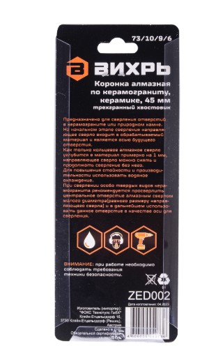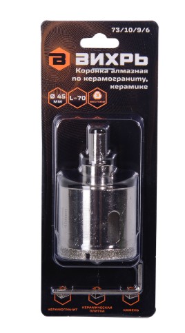 Коронка алмазная Вихрь по керамограниту/керамике, 45 мм для работы с электродрелями в безударном режиме с охлаждением водой.