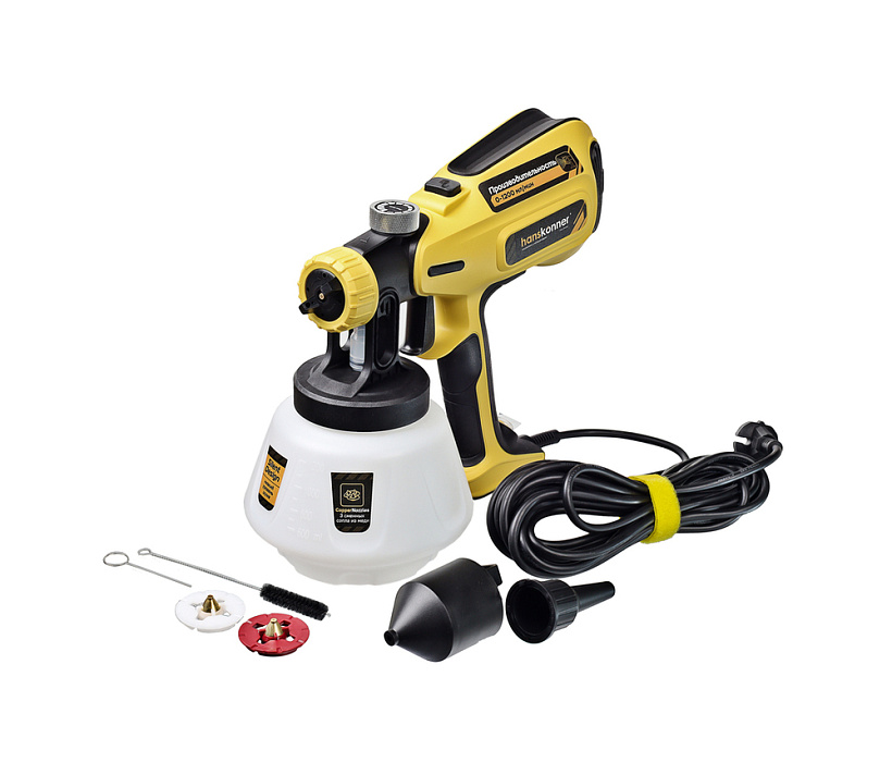 Hanskonner HSG9680 – универсальный электрический краскопульт. Отлично подходит для покраски фасадов зданий и ограждений, а также для проведения внутренних ремонтных работ. Позволяет эффективно работать в том числе и с наиболее вязкими материалами. Модель оснащена мощным 800 Вт электромотором и демонстрирует высокую, одну из лучших в классе, производительность в 1200 мл / мин.