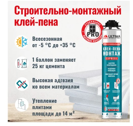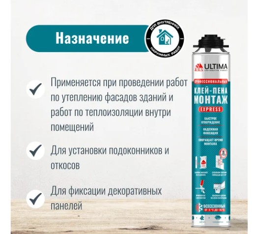ULTIMA Express МОНТАЖ – это профессиональное решение для быстрого и надежного крепления теплоизоляционных и отделочных материалов. Благодаря отличной адгезии, удобству нанесения и широкой сфере применения клей-пена станет незаменимым помощником в строительстве и ремонте.