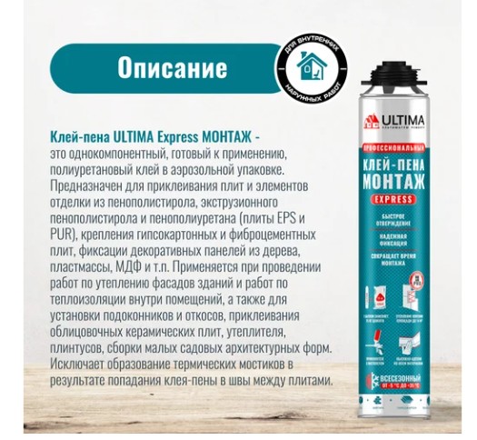ULTIMA Express МОНТАЖ, строительно-монтажный клей-пена, 750 мл UGLUPU750 – это однокомпонентный полиуретановый клей-пена, предназначенный для профессионального и бытового применения. Используется для монтажа плит из пенополистирола (EPS), экструзионного пенополистирола (XPS), пенополиуретана (PUR), гипсокартона, фиброцементных плит, а также деревянных, пластиковых и МДФ-панелей. Подходит для внутренних и наружных работ, включая утепление фасадов, монтаж подоконников и откосов. Обладает высокой адгезией к бетону, кирпичу, металлу и другим строительным материалам, обеспечивает надежную фиксацию без термических мостиков.