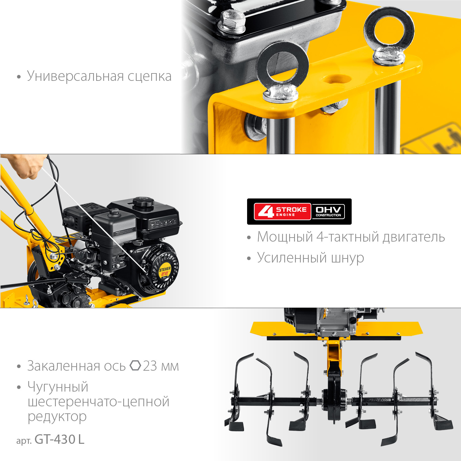 - Универсальная сцепка позволяет использовать различное навесное оборудование