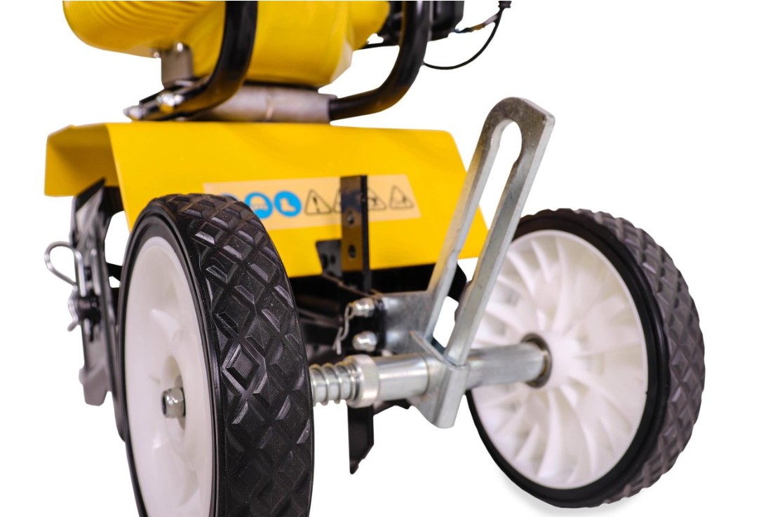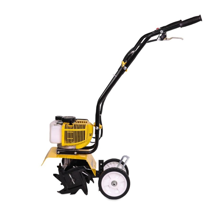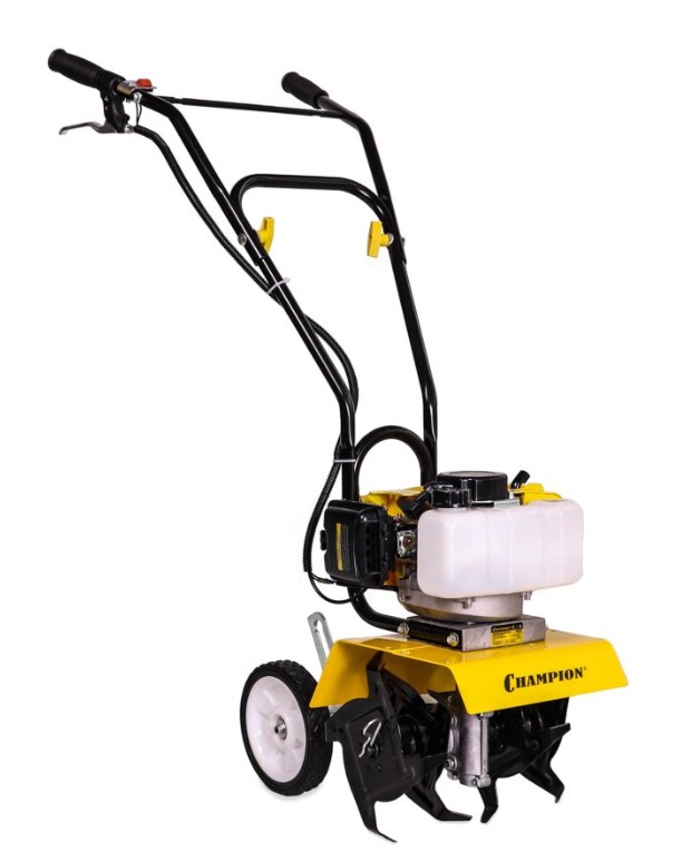Культиватор Champion GC 252 комплектуется двойными транспортировочными колесиками, которые при работе опрокидываются вверх, позволяя выставить глубину обработки при помощи сошника. Двигатель культиватора, для простоты запуска, оборудован примером подкачки топливной смеси напрямую в карбюратор и двух диапазонной воздушной заслонкой, обеспечивающей запуск не прогретого мотора.