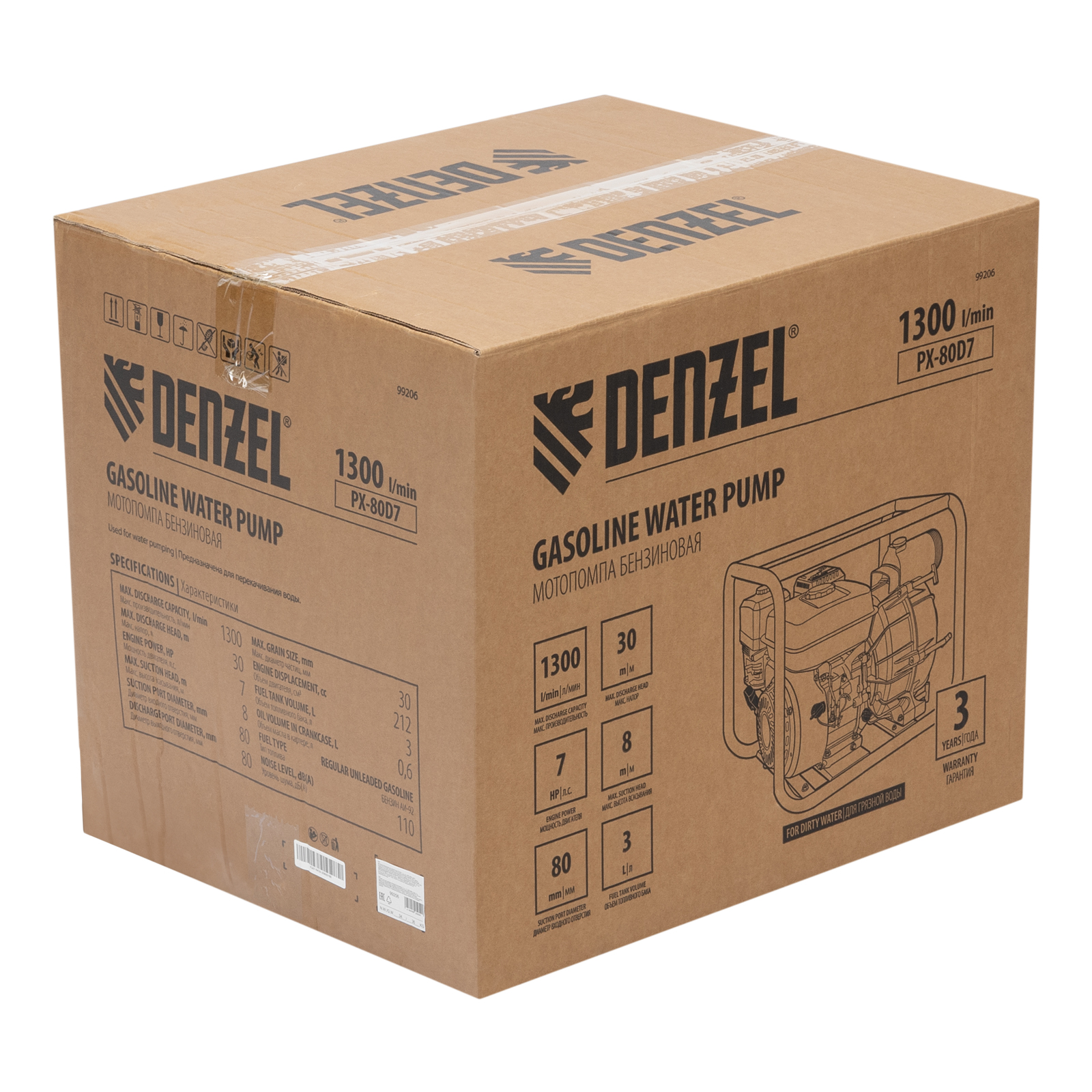 Бензиновая мотопомпа Denzel PX-80D7 99206 с двигателем мощностью 7 л. с. и штуцерами диаметром 3" обеспечивает напор 30 м и применяется для откачки грязной воды со скоростью 1300 л/мин из затопленных помещений, а также бассейнов, котлованов, траншей, погребов, колодцев глубиной до 8 м. Диаметр входного и выходного отверстий составляет 80 мм, что обеспечивает высокую производительность. Мотопомпа оптимальна для использования во время земляных работ, т. к. может работать с сильно загрязненной водой, содержащей фракции диаметром до 30 мм. Также подходит для подачи чистой воды на строительную площадку, небольшое предприятие, дачный участок и в систему полива.