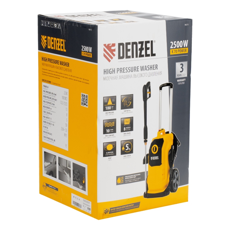 Моечная машина высокого давления Denzel K 70 Power мощностью 2500 Вт и производительностью 600 л/ч, с асинхронным двигателем, обеспечивает подачу воды под давлением до 180 бар. Позволяет при помощи струи воды отмыть фасад дома, дорожку, тротуар, садовую мебель, технику и инструменты, автомобиль, окна и т.д.