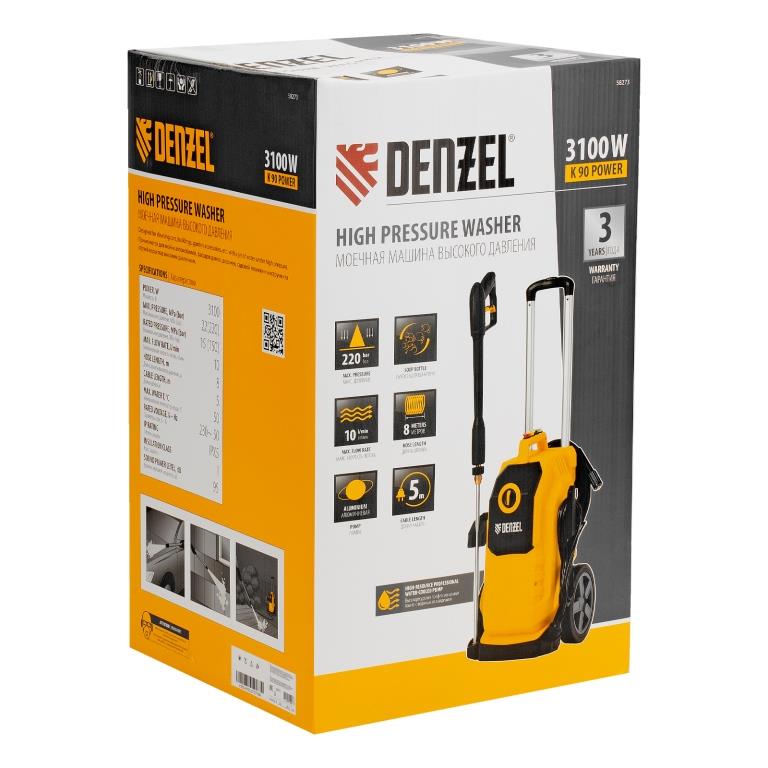 Моечная машина высокого давления Denzel K 90 Power 58273 мощностью 3100 Вт и производительностью 600 л/ч, с асинхронным двигателем, обеспечивает подачу воды под давлением до 220 бар. Позволяет при помощи струи воды отмыть фасад дома, дорожку, тротуар, садовую мебель, технику и инструменты, автомобиль, окна и т.д.